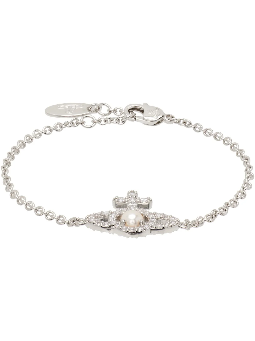 Rolo chain bracelet in silver-tone brass. · Logo charm with pave-set glass crystals and faux-pearl · Logo plaque at adjustable lobster-clasp fastening · L7.5" Supplier color: Platinum/Creamrose Pearl/White CZ Brass. Made in Thailand 261314M142002