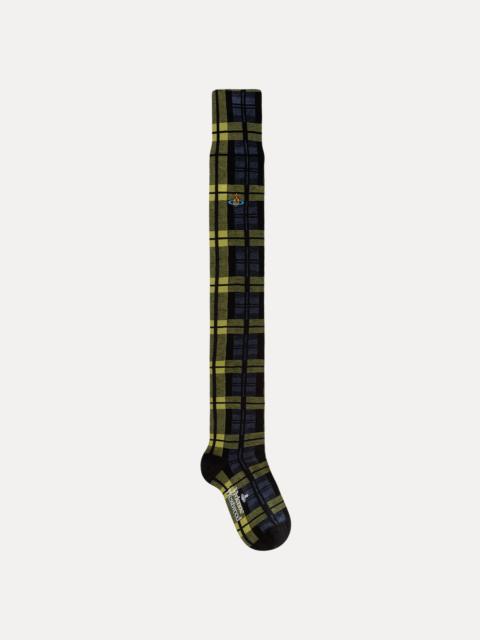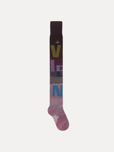 The Over The Knee socks offer this season's striking 'Logomania' jacquard and are crafted from an extra-fine merino wool blend. The pair are finished with the house's orb motif embroidered in multi-coloured thread, which symbolises tradition, encircled by the celestial rings of Saturn, symbolising the future. Code: 8053195327485 - Features ribbed trims - Over the knee fit - Knitted jacquard - Multi-coloured orb - Ribbed trims - Pulls on - Round toe - Tonal stitching - Signature lettering motif at the soles. - Added stretch for comfort - Made in Italy COMPOSITION - 38% Viscose - 30% Cashmere - 29% Polyamide - 3% Elastane