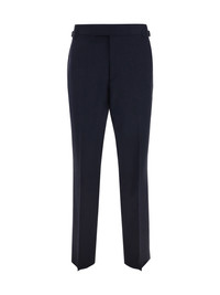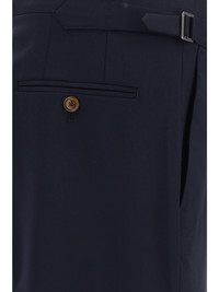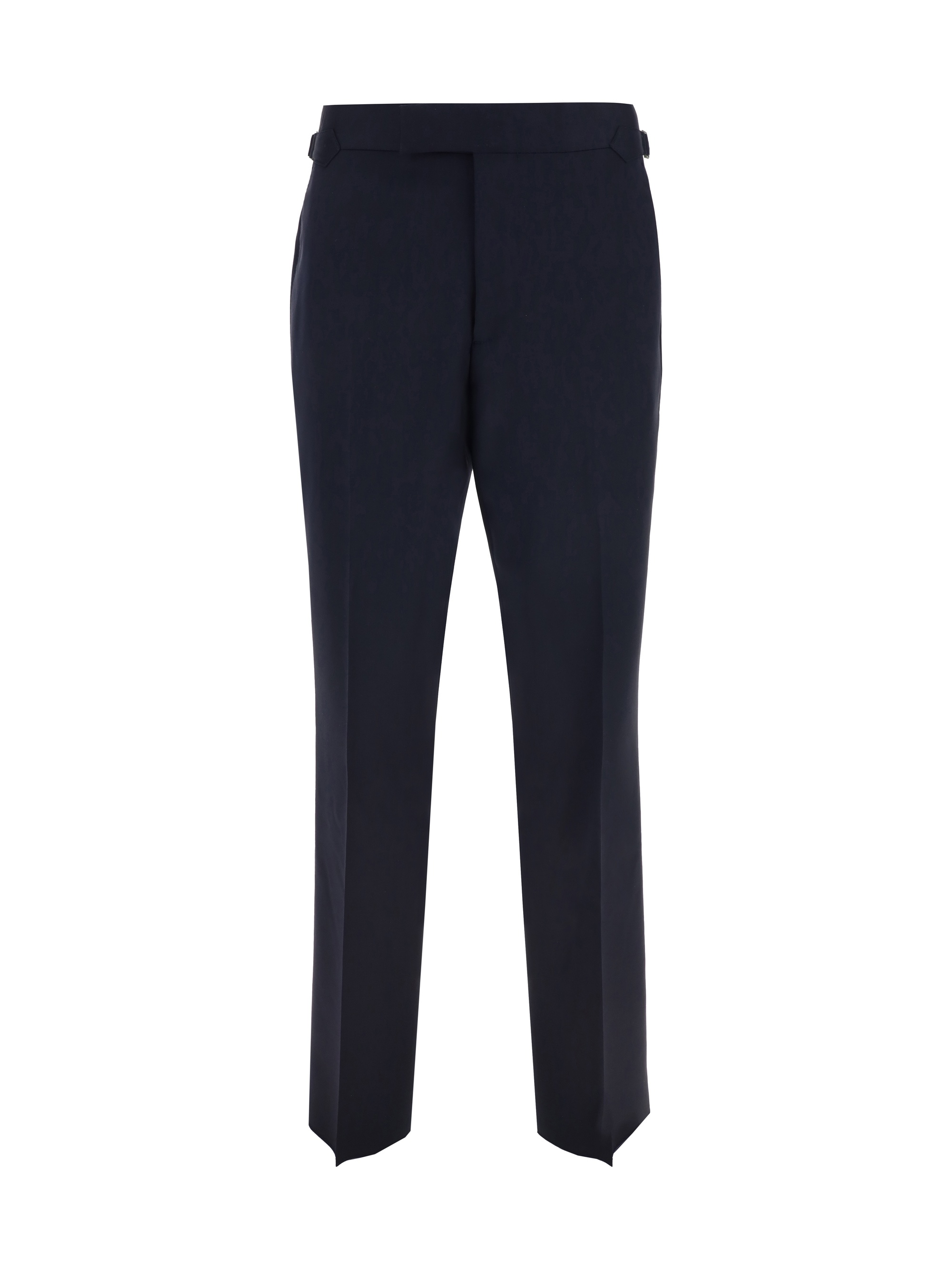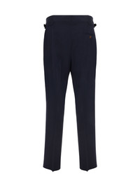 Virgin Wool Pants by Vivienne Westwood, front hook-and-zipper closure, two side slash pockets, two back welt pockets, adjustable waistband via side martingale, monochrome pattern, regular fit. DETAILS sku 2F01000RW00QN_K401 composition: FLEECE WOOL 100% color group: BLUE gender: MAN season: AW24 size chart: RTW IT category name: PANTS