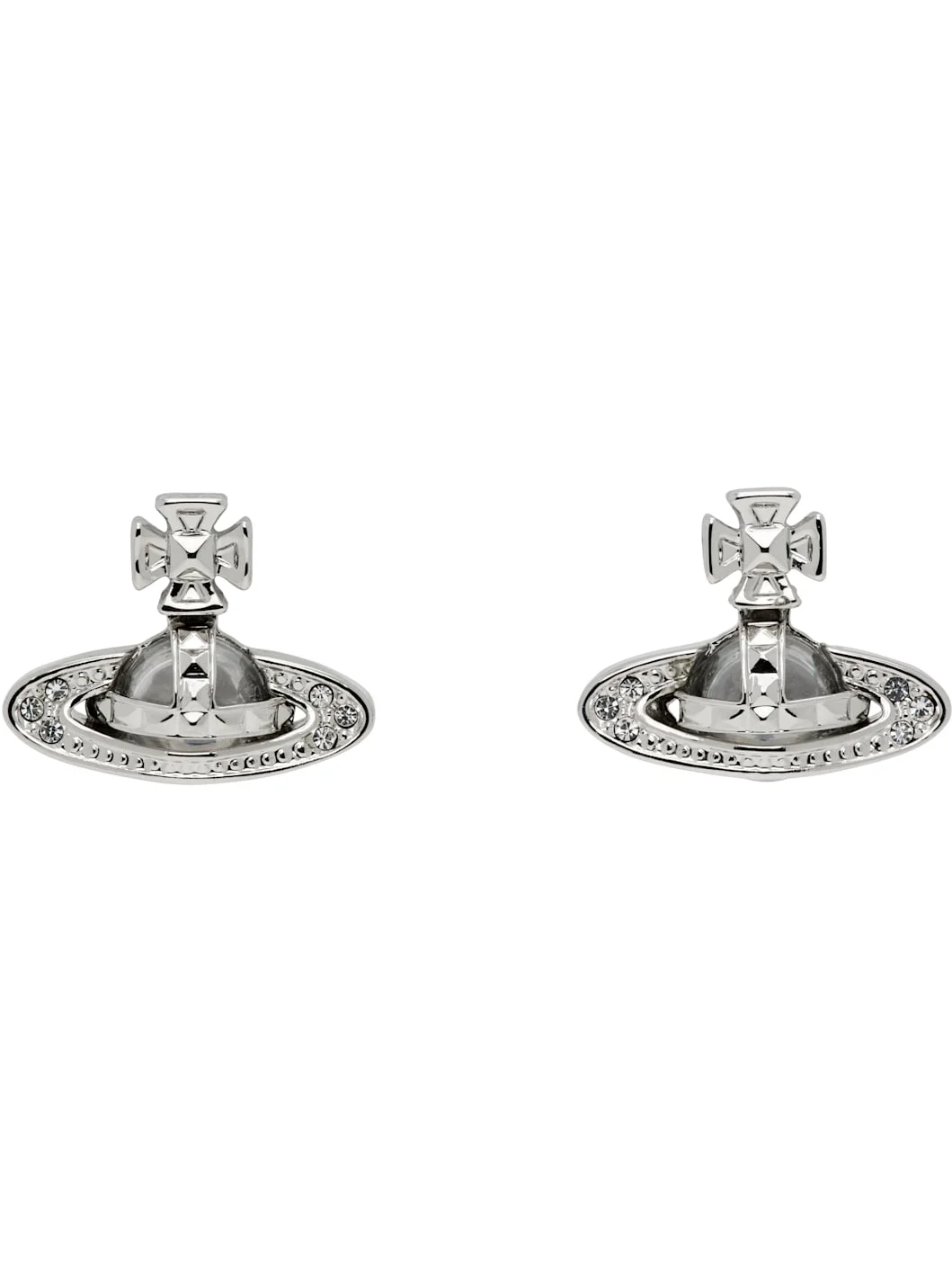 Pair of stud earrings in silver-tone brass. · Logo with pave-set crystals at face · Post-stud fastening · H0.5" x W0.75" Supplier color: Platinum/Crystal Brass. Made in Thailand 261314M144003