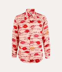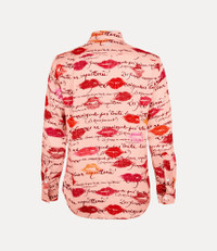 Our Tuxedo shirt features an exaggerated pointed collar, complete with a concealed button placket. The piece is adorned with the ‘Kisses’ artwork, inspired by our 'Boudoir' perfume packaging, layered with Vivienne's hand-written ‘Les Femmes Ne Connaissent Pas Toute Leur Coquetterie’ motif. Code: 24010048-W017G--KISSES - Features buttoned barrel cuffs - Long sleeves - Structured cuffs - Slim fit - Darted construction - Curved hemline - Minimalist detailing - Classic shirt length COMPOSITION - Buttons: engraved mother-of-pearl - Main material: 100% Viscose - Viscose derived from wood pulp sourced from forests managed in accordance with certified forestry standards.