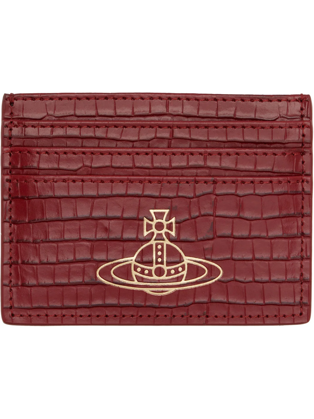 Croc-embossed leather card holder. · Logo stamp at face · Four card slots · Central note slot · Textile lining · H3" x W4" Supplier color: Red Leather. Made in Italy 252314M163061