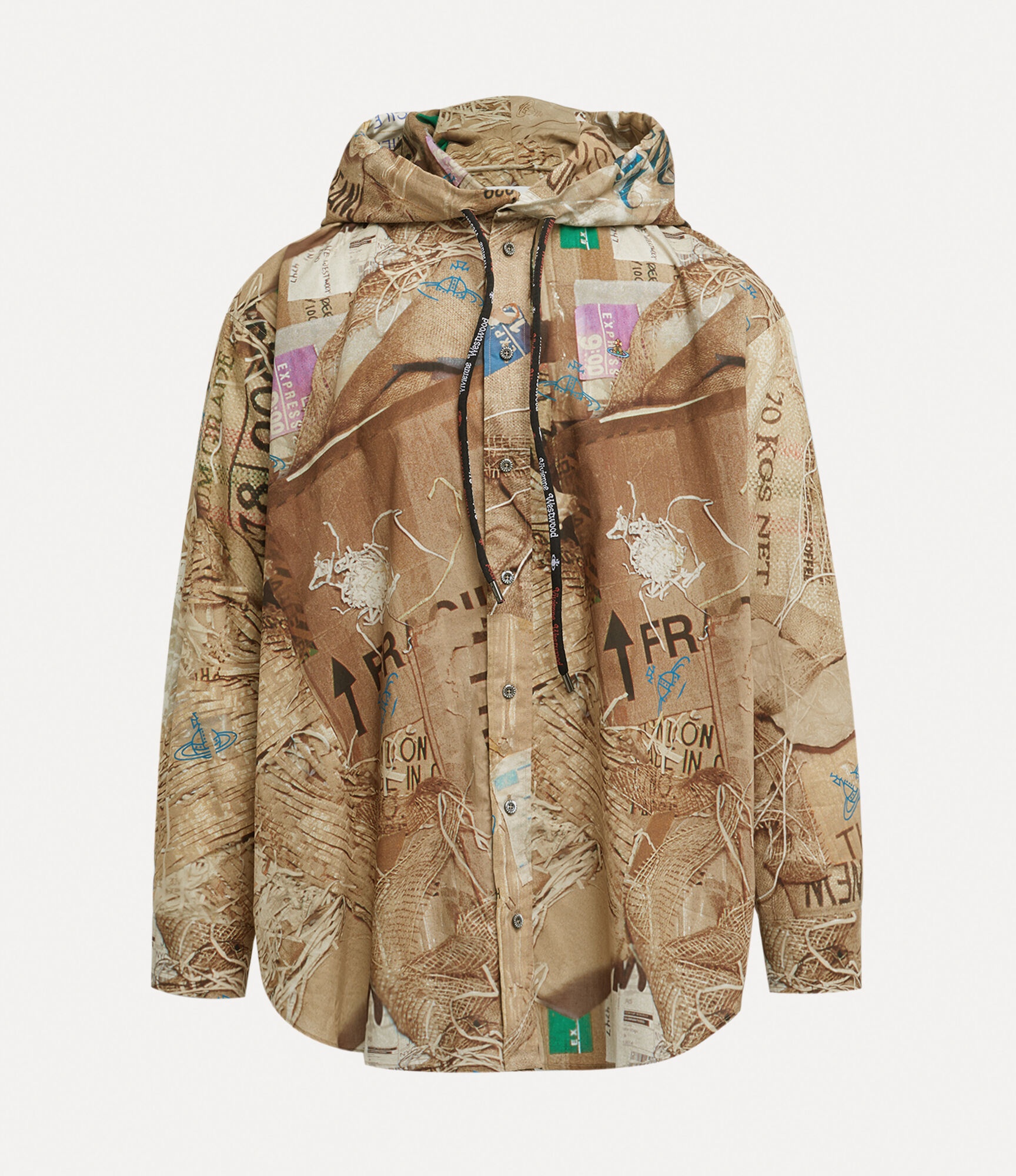 The Rib Hoodie shirt features a drawstring hood and showcases our archive 'Rubbish' print from the Vivienne Westwood Spring-Summer 2004 collection, titled 'Blue Skies'. T he graphic features a collage of packaging and cardboard images - evoking the concept of upcycling newspapers by using them to wrap valuable ornaments when moving house. Code: 2401003R-W00VJ--TRASH - Long sleeves - Two front zip pockets - Buttoned fastening - Curved hem - Dropped shoulders - Unisex - Lightweight - Fits true to size COMPOSITION - 100% Cotton