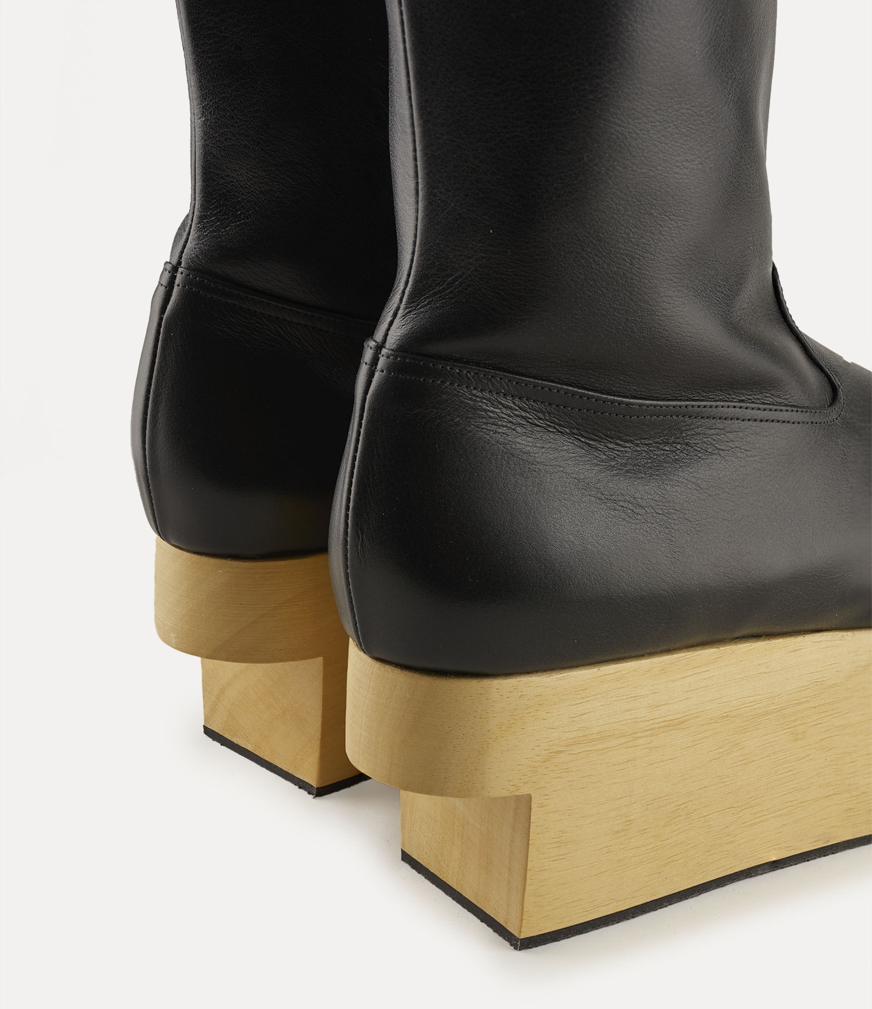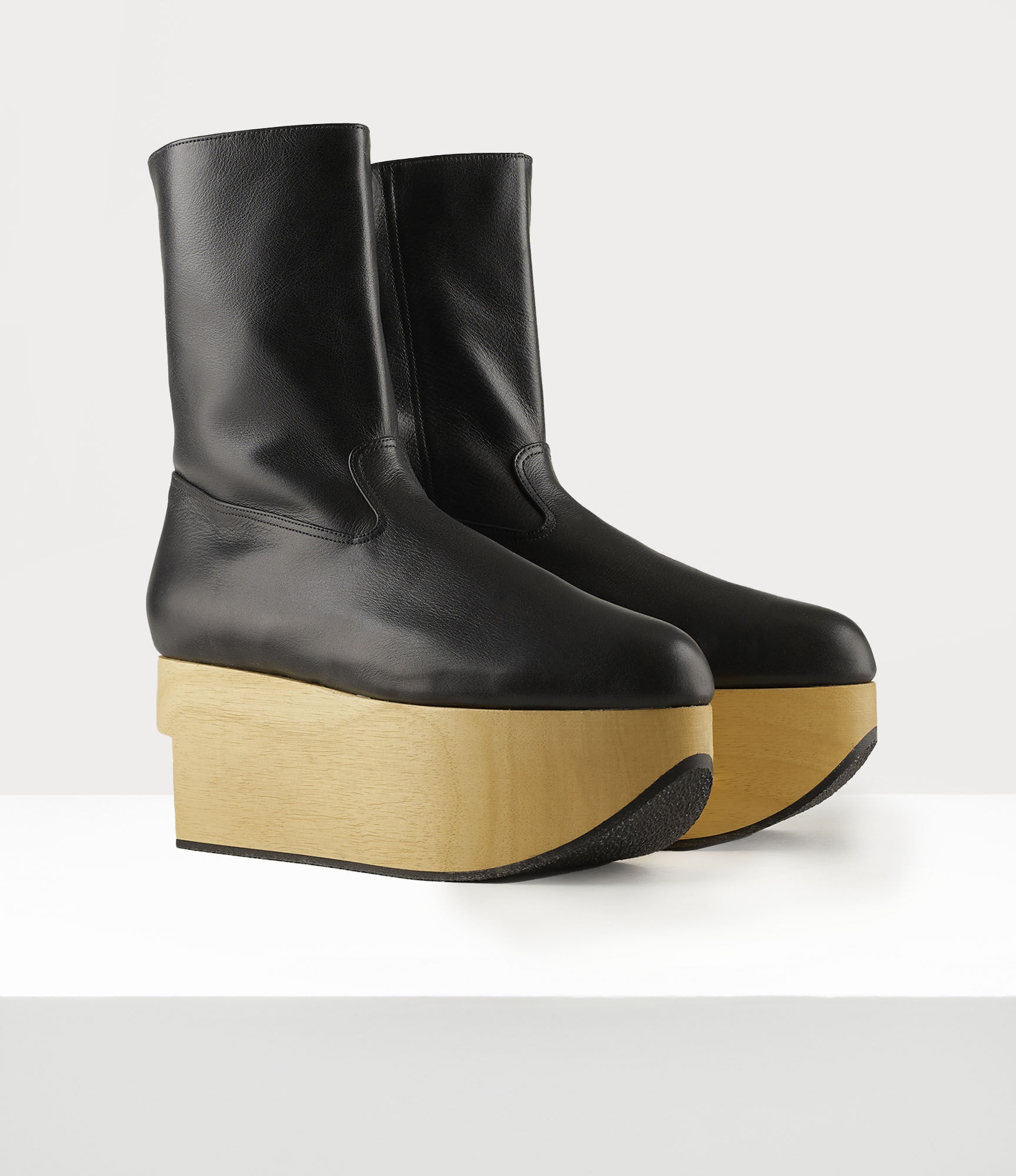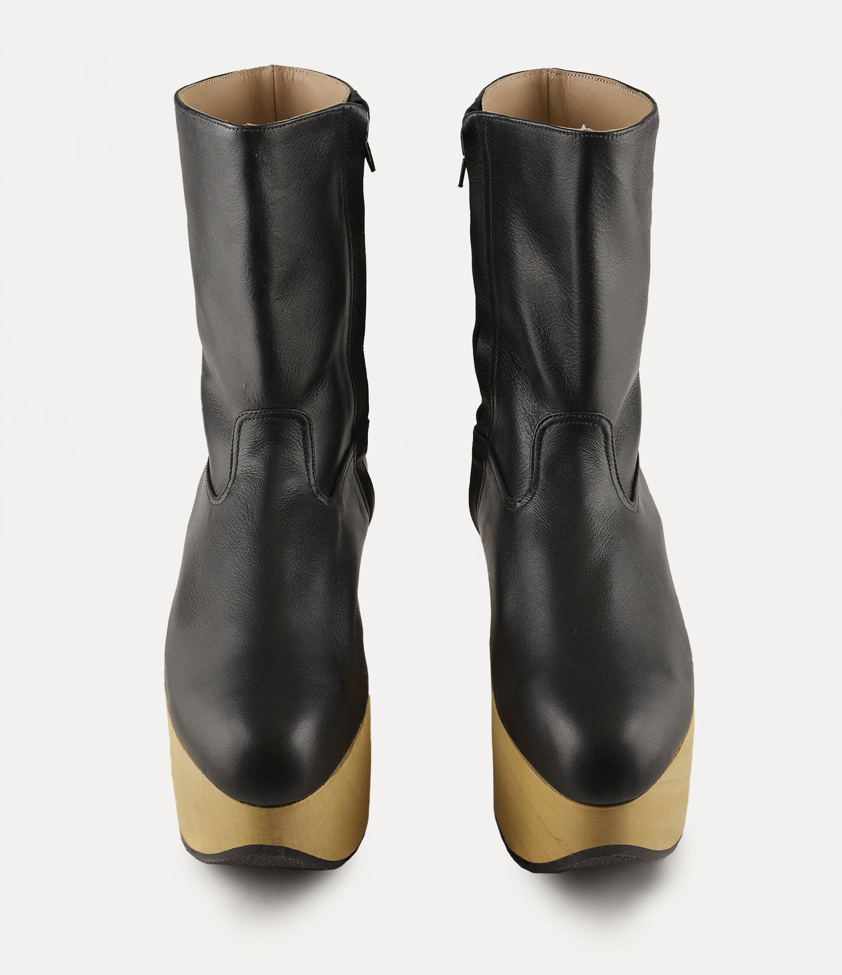 First created for Vivienne's Spring-Summer 1985 'Mini-Crini' catwalk show, the Rocking Horse boots in black leather are detailed with a side zip closure. Cut-away detailing Embossed logo at the inner sole Zip fastening Platform heel 7.5cm Code: 7101007042062N401 Details & Features Do not allow your product to get wet or damp. Store in the provided care bag, in a dry and well-ventilated place.