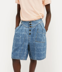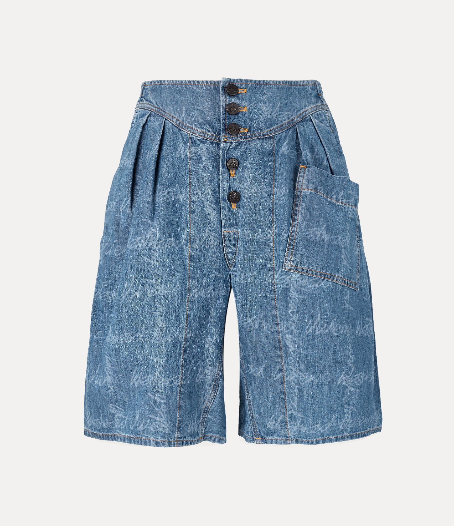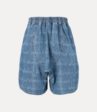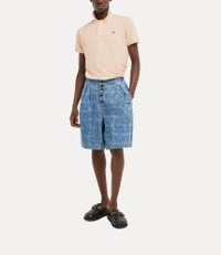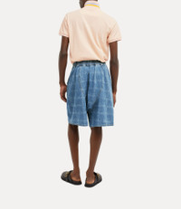 The denim Romario Bermuda shorts feature embossed orb rivet buttons, a yoke-style waistband, and pleat detailing on the front. The design revives the hand-drawn Vivienne Westwood Signature tartan, originally introduced in the Autumn-Winter 2005 Red Label collection, evoking the house's iconic punk style. Code: 39060002-W014J--VW-GRID-BLUE - Unisex style - Mid-rise waistband - Pocket on the front - contrast top-stitching - Made in Italy - Model is 6’0/183cm and is wearing a size M COMPOSITION - 100% Cotton