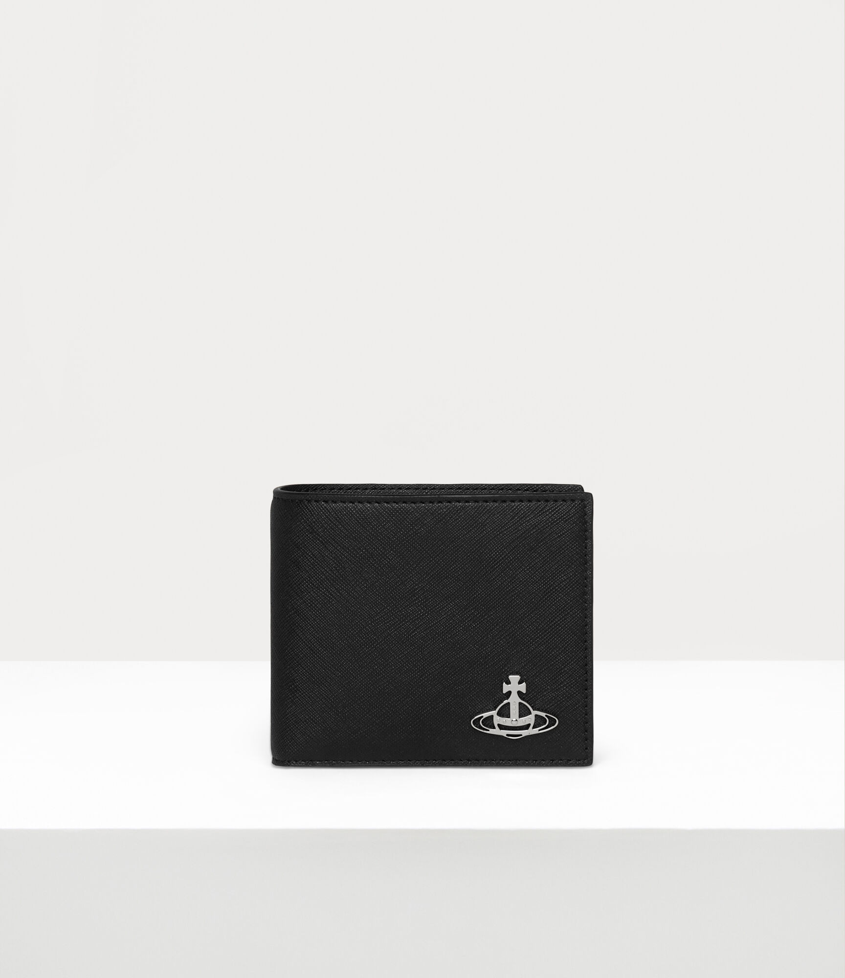 The Saffiano Man wallet features an internal coin compartment secured with a press-stud closure, delicately embossed with the house's signature lettering motif beneath the row of card slots. The piece offers a saffiano-effect embossed finish, adorned with an orb motif in the corner - echoing Vivienne's vision of propelling tradition into the future. Code: 8053195062041 - Features three credit card slots - One note slot - Press-stud coin compartment - Measurements: height 9.5cm, width 10.5cm - Made in Italy COMPOSITION - 65% Polyurethane - 35% Cotton