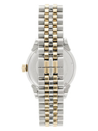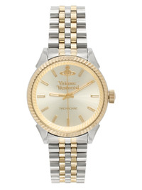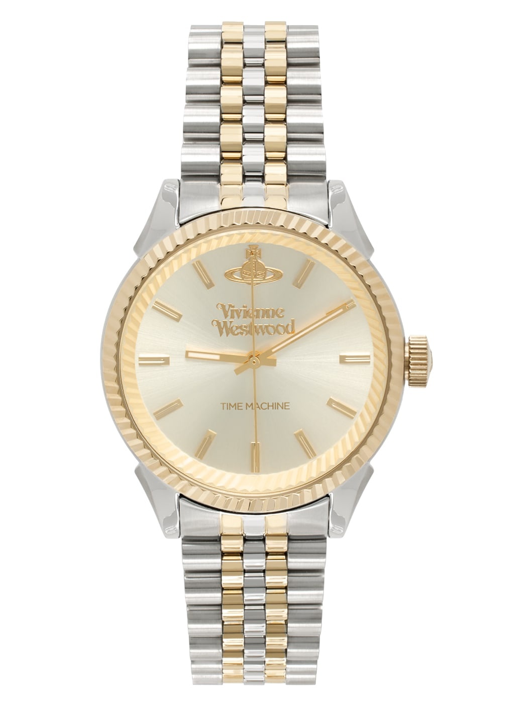 Lugged round case in polished gold-tone stainless steel. Coin-edge bezel. Flat mineral glass lens. Logo and markers in gold tone. Sunray dial. Logo-engraved push-pull crown. Jubilee bracelet in gold- and silver-tone stainless steel. Butterfly-buckle fastening. Three-hand Swiss quartz movement. 50m water resistance. Logo engraved at case back. Two-year limited Vivienne Westwood warranty. Approx. 45mm case width x 10mm case depth; 0.75" bracelet width. Supplier color: Silver/Gold