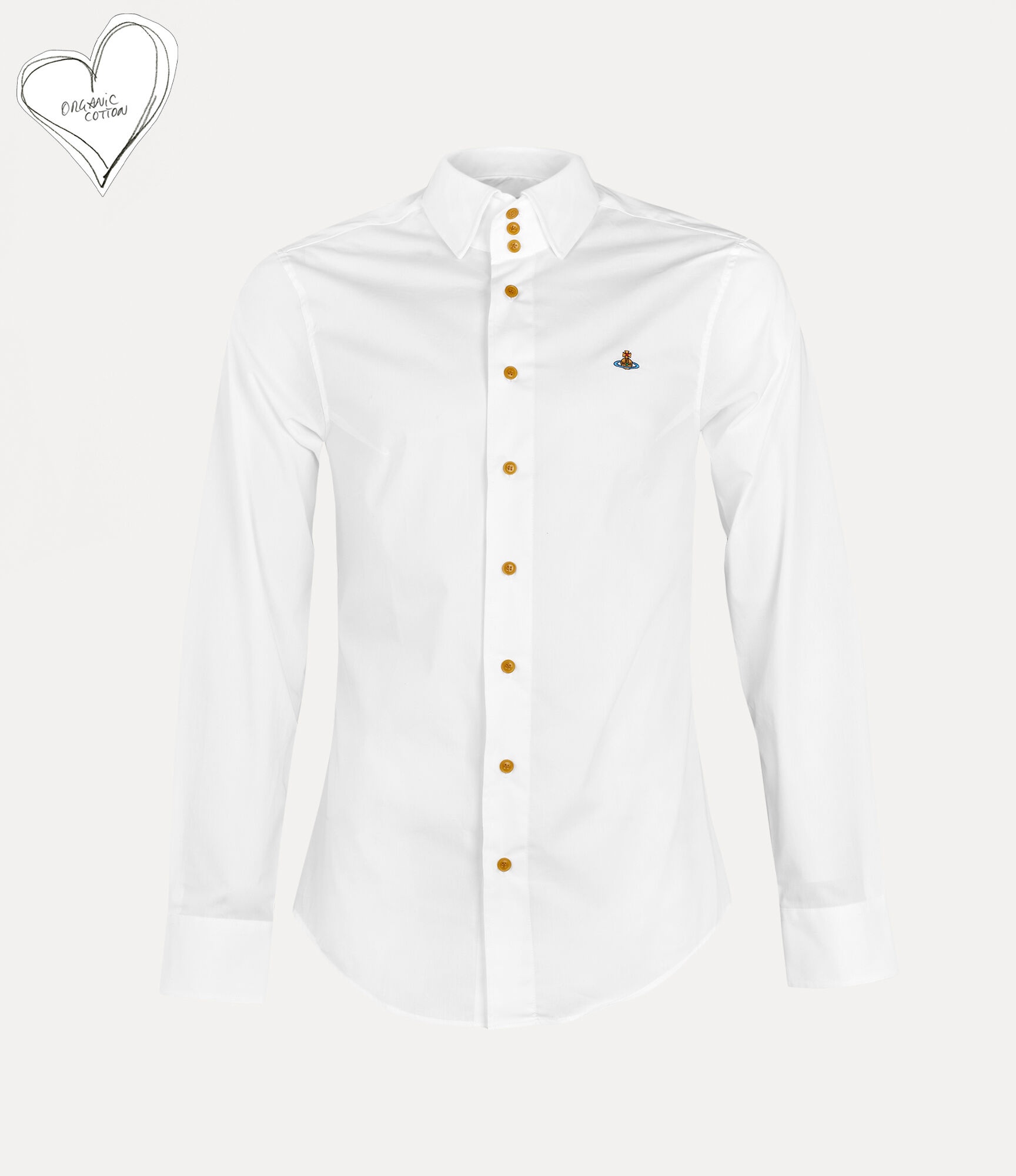 Defined by its three-button collar, Vivienne's Stretch Krall shirt in organic stretch-cotton is cut for a slim fit silhouette and features our orb embroidered on the chest. Through the use of organic farming which has a low impact on the environment, organic cotton is grown without the use of harmful chemicals and pesticides, avoiding the risks that such chemicals pose to human health and the environment. Material 100% Organic Cotton Code: 24010009W005FA401 Details & Features Three button collar Button fastening Orb embroidery