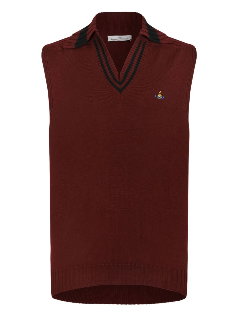 striped sleeveless jacket Highlights - Dark red - V-neck - Striped collar - Sleeveless - Embroidered logo - Ribbed detail Made in Italy Composition Virgin Wool 100% Washing instructions Read Manufacturer Guidelines