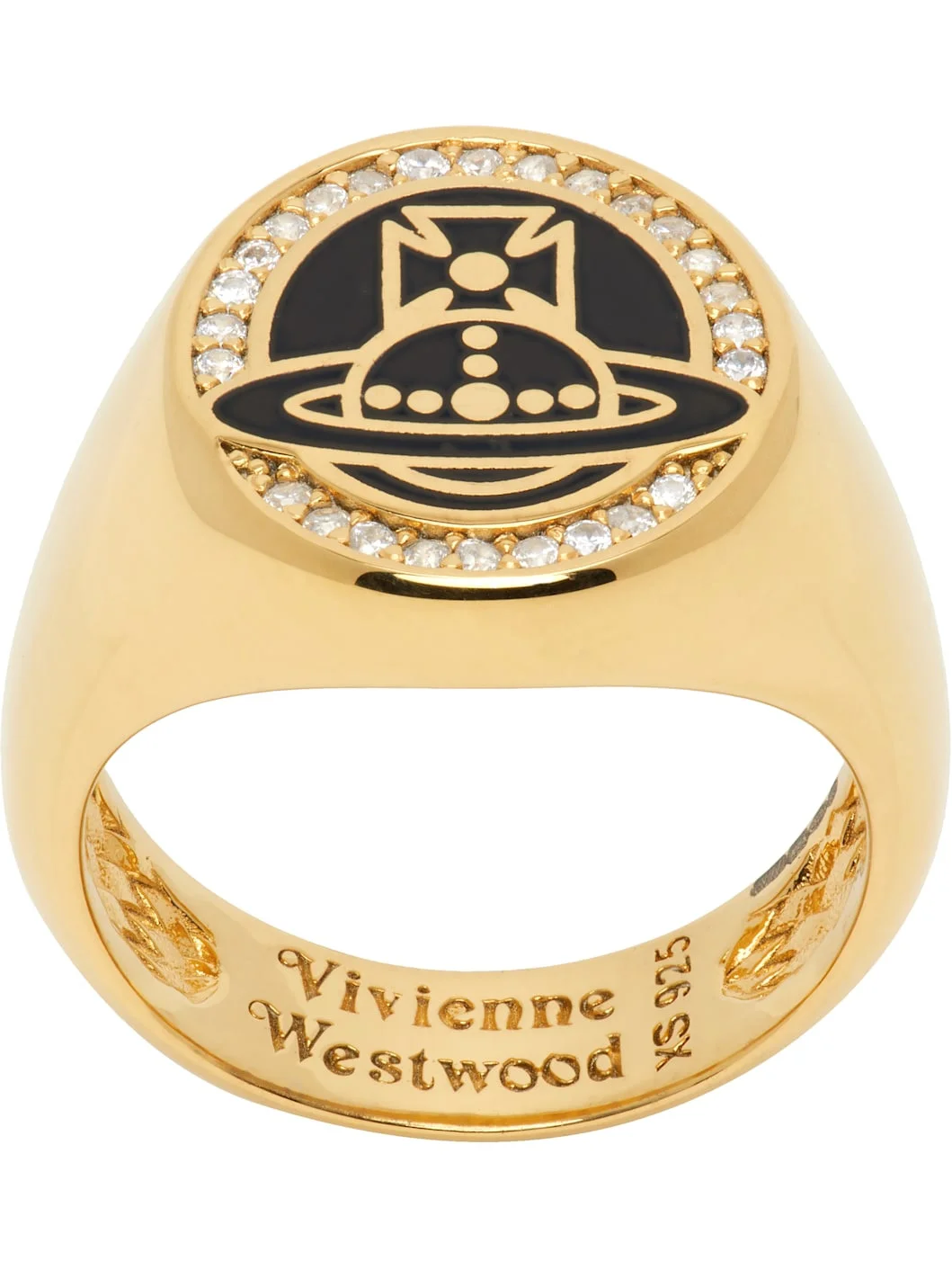 Signet ring in gold-tone sterling silver. · Black resin, cubic zirconia stones, and logo at face · Hallmarking at interior Supplier color: Gold 925 sterling silver, resin, cubic zirconia. Made in Thailand 251314M147032