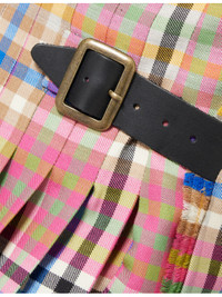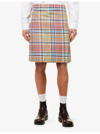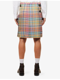 PRODUCT DETAILS - Vivienne Westwood wool kilt - 100% wool - Buckle fastening - Regular fit, mid-rise, adjustable buckle tabs at waistband, wrap-round front, pressed pleats at back, all-over tartan, unlined - Dry clean - Made in UK - True to size - Size Medium: length 17.5in / 45cm - Model is 6ft 2in/1.88m and wears a size UK 38 - Midweight, non-stretch Ref: R04550484