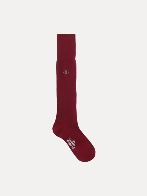 Our High Uni Colour socks feature a soft wool-blend finish with a knee-length silhouette. The piece receives our multicoloured orb embroidery, complete with the signature Vivienne Westwood lettering motif at the sole - synonymous with the ethos of launching the past into the future. Code: 81040002-K0025--RED - Features a pull-on design - Knee-high fit - ’Vivienne Westwood’ printed on sole - Embroidered orb motif - Round toe - Tonal stitching - Ribbed trims - Added stretch for comfort - Made in Italy COMPOSITION - 25% polyamide - 75% wool