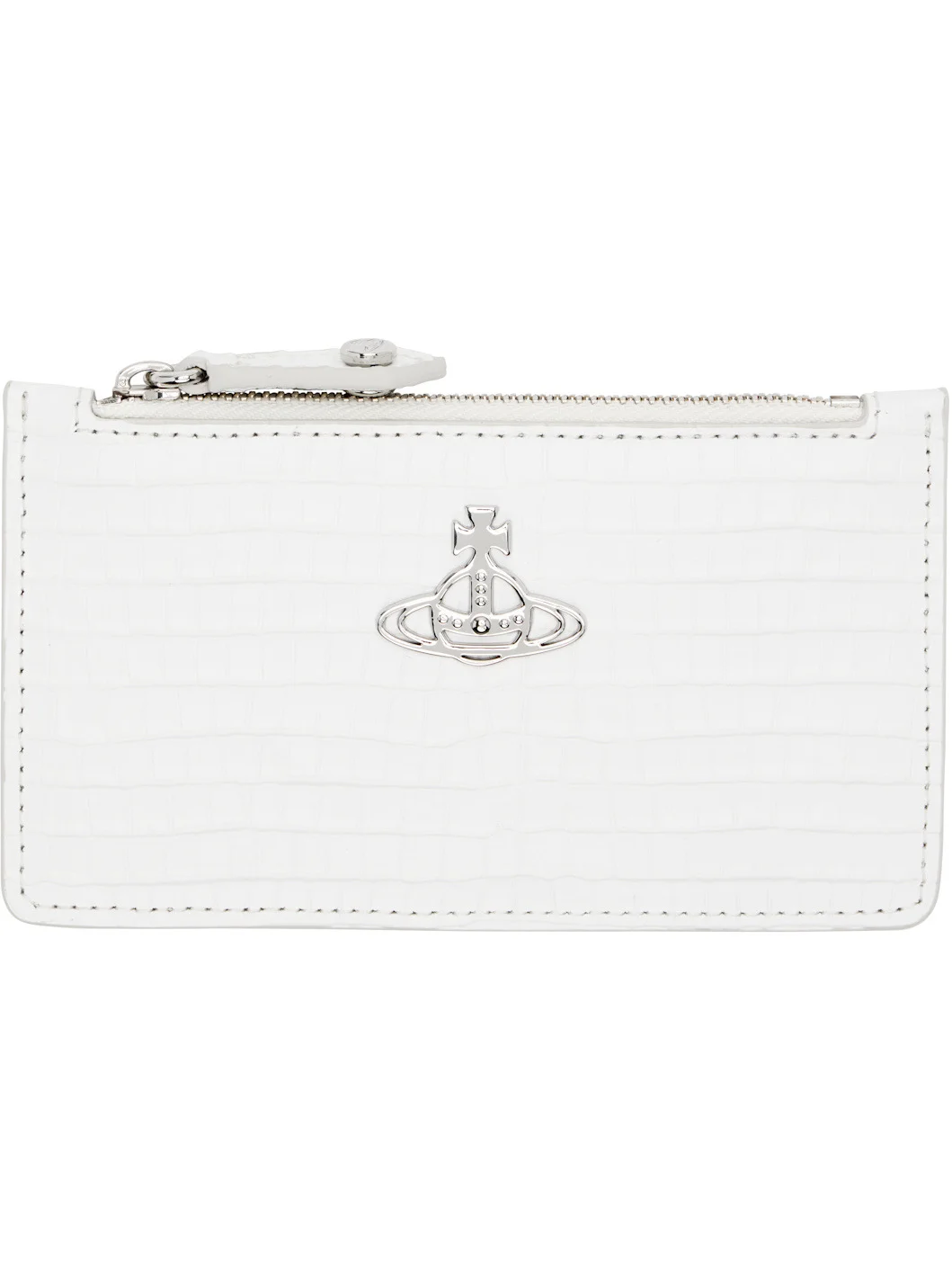 Croc-embossed calfskin card holder. · Logo hardware at face · Four card slots at back face · Zip closure · Faille lining · Silver-tone hardware · H3" x W5.5" Supplier color: White Calfskin. Made in Italy 252314M163031