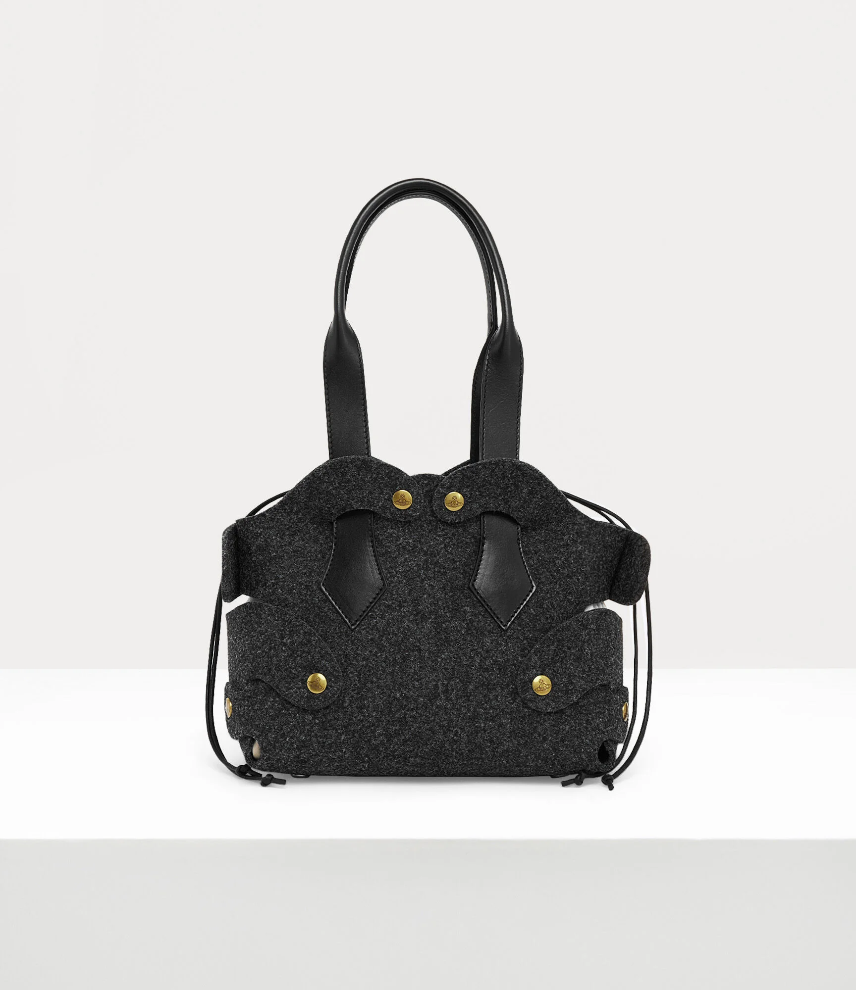 The Wilma Small tote is crafted from thick wool felt using a no-waste cutting technique first developed for the Autumn-Winter 2007 ‘Wake Up Cavegirl’ collection. Inspired by our archival Flintstone bags, the piece features a modular popper system and signature spearhead handles threaded through the outer shell. Code: 8053195232994 - Features gold-tone hardware - Orb-engraved finishings - Structured base - Compact size - Interior detachable calico drawstring pouch - Soft, structural finish - Length 30cm, height 22cm, depth 16cm - Unisex - Made in Italy COMPOSITION - Main material: 100% Polyester - The 'Jacquard Orb' lining is made of 100% polyester