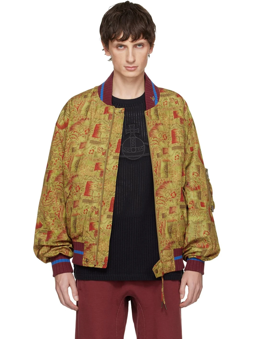 Reversible padded recycled polyester taffeta bomber jacket. Graphic pattern printed throughout. Reverse in black quilted satin. · Striped rib-knit stand collar, hem, and cuffs · Logo embroidered at stand collar · Zip closure · Flap pockets at waist · Dropped shoulders · Zip pocket at sleeve · Fully lined Supplier color: Leaves on gold/Black Body: 100% polyester. Trim 1: 100% cotton. Trim 2: 98% cotton, 2% elastane. Fill: 100% polyester. Lining: 100% polyester. Made in Turkey 252314M175001