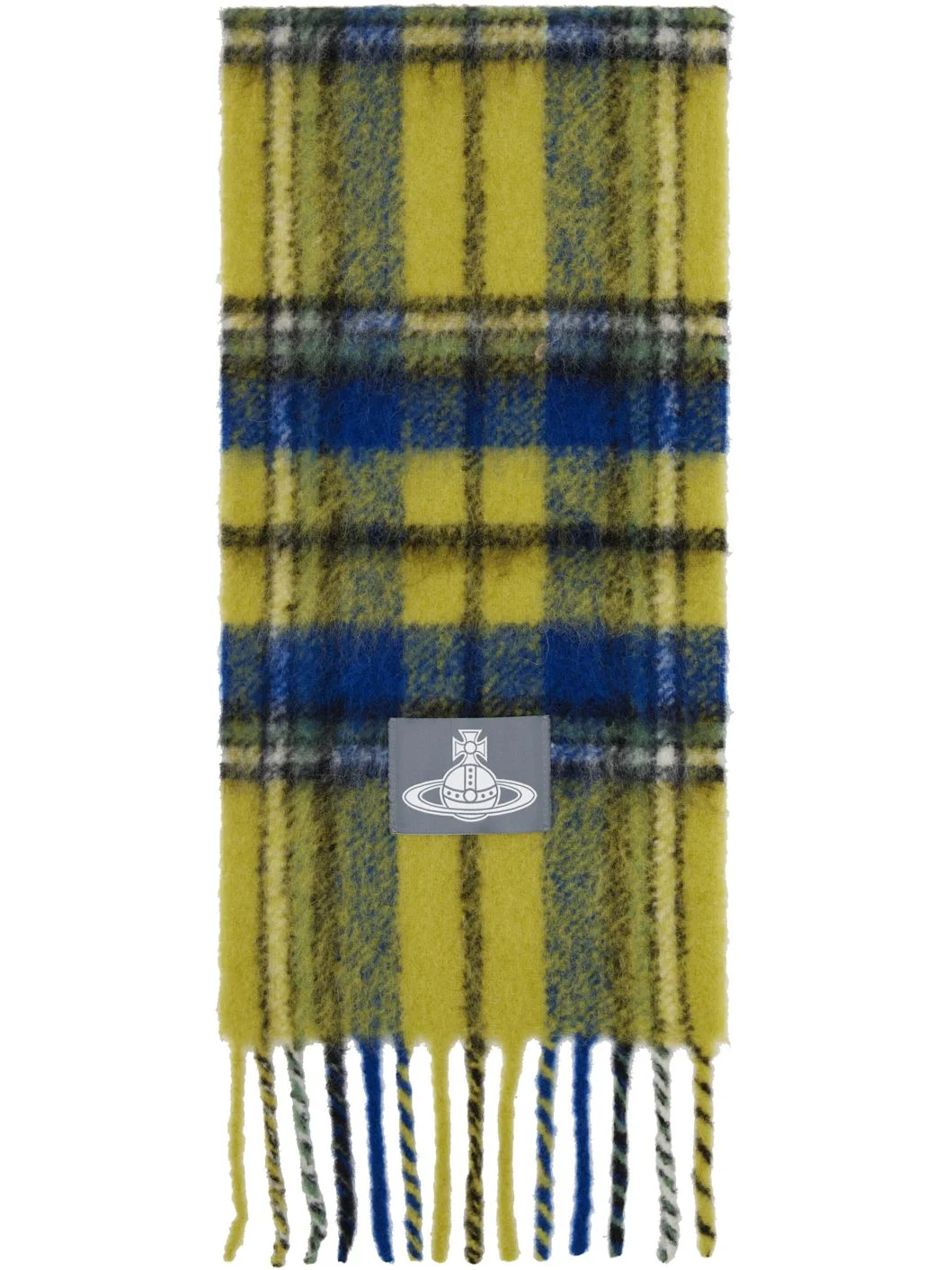 Rectangular brushed alpaca-blend flannel scarf. · Check pattern throughout · Logo patch at face · Fringed detailing at ends · L74" x W12" Supplier color: Yellow 70% alpaca, 20% polyamide, 10% wool. Made in Italy 252314M150006
