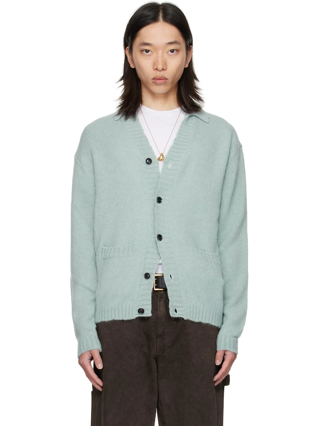 Knit alpaca-blend cardigan. · Rib-knit spread collar, placket, hem, and cuffs · Button closure · Welt pockets at front · Dropped shoulders Supplier color: Light blue 74% alpaca, 26% nylon. Made in Japan 252326M200000