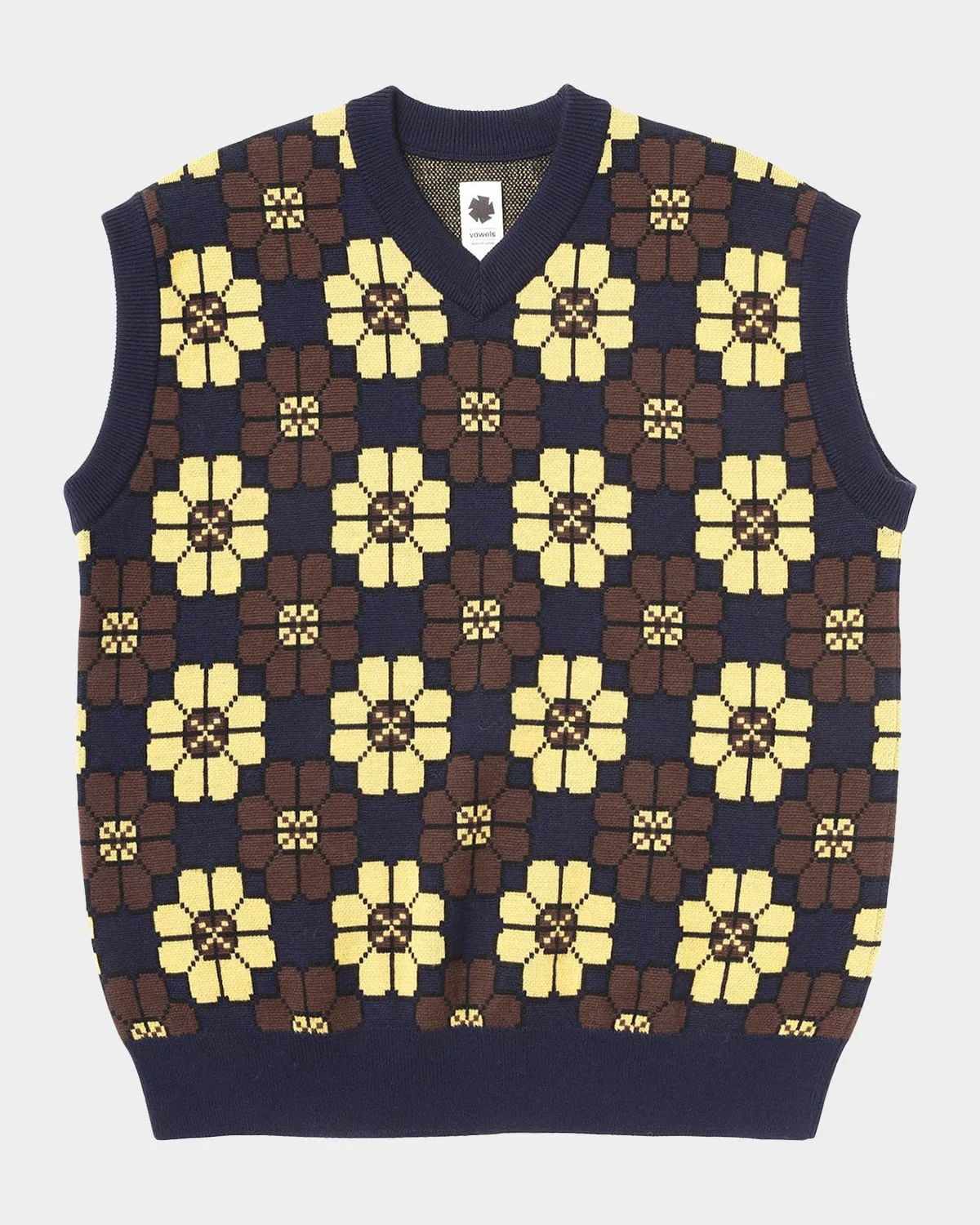 This knit vest from vowels is made with carefully selected extrafine wool, resulting in a soft texture, excellent color vibrancy, and volume. Custom 12G double jacquard knit flower pattern Vneckline Ribbed hem and armholes Contrast trim Pullover style Classic fit Wool Dry clean Made in Japan