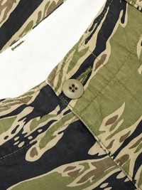 tiger camo-print six-pocket trousers Highlights - Olive green - Tiger stripe camouflage pattern - Six pockets - Button fastening - Adjustable waist belt - Tonal topstitching Imported Composition Cotton 100% Washing instructions Read Manufacturer Guidelines