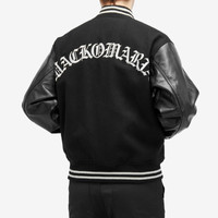 Add elegance and collegiate style to your looks with this Wacko Maria Type-2 Leather Varsity Jacket. Featuring melton wool fabric on the body, leather sleeves offer contrast detailing. With sporty ribbed trims, gothic imbued logos appear on the chest and reverse. - 90% Wool, 10% Nylon - Leather Sleeves - Shawl Collar - Button Closure - Side Pockets - Ribbed Trims