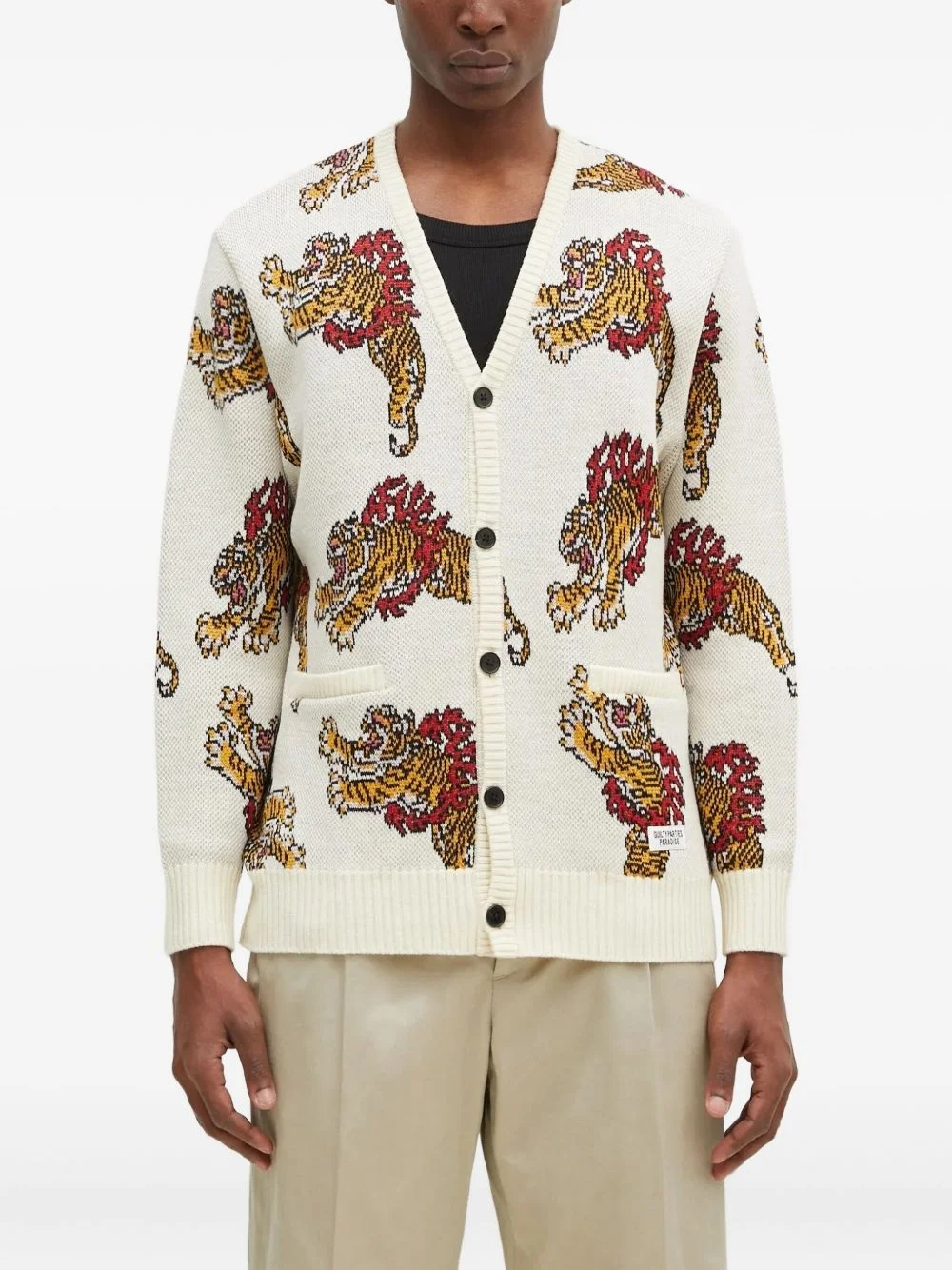 x Tim Lehi tiger-patterned cardigan Highlights - Light beige - Tiger pattern - Button front - V-neck - Welt pockets - Ribbed trims Imported Composition Wool 100%
