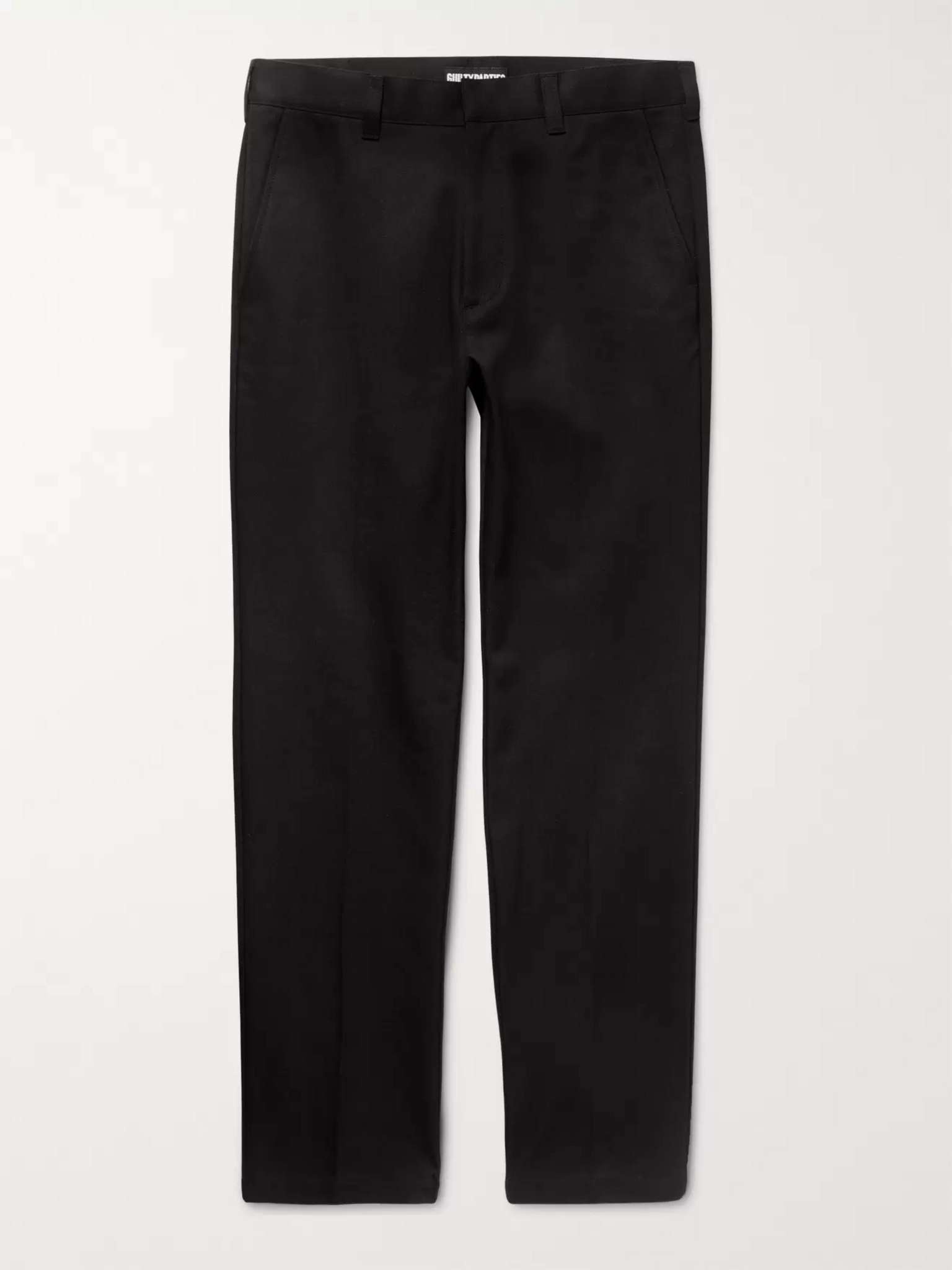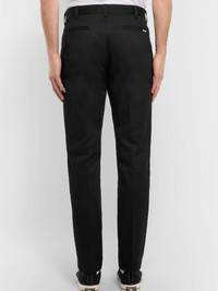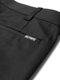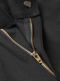 - Black twill - Belt loops, four pockets, pressed creases - Hook and zip fastening - 65% polyester, 35% cotton - Machine wash - Made in Japan