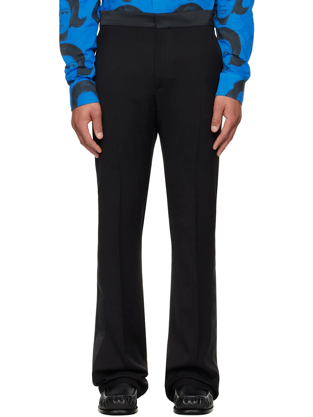 Virgin wool barathea trousers. · Flared leg · Sateen trim at waistband and outseams · Cinch tabs at waistband · Four-pocket styling · Zip fly · Creased legs Supplier color: Black Body: 100% virgin wool. Trim 1: 100% polyester. Trim 2: 100% cotton. Lining 1: 100% viscose. Made in Italy 252752M191003