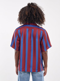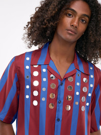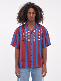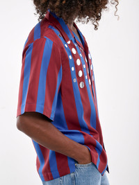 WALES BONNER shirt in red & blue, paneled silk construction, stripe pattern, camp collar, front buttoned placket closure, short sleeves, front mirror embellishment, straight hem, regular fit. Made in Italy 100% Silk European Sizing Model is 5'11" wearing size 50. Shoulders: 18" Chest: 36.5" Waist: 29"