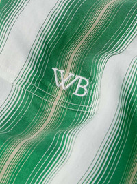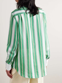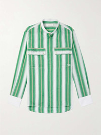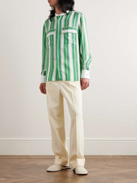 Wales Bonner's 'Cadence' shirt is striped with rows of green and beige stripes that fade into one another. Cut for a relaxed fit, it has a contrasting poplin grandad collar and cuffs and buttoned flap pockets - one is embroidered with the brand's initials. Size & Fit - Model wears a size larger to achieve a looser fit - Lightweight, non-stretchy fabric - Model is shown wearing an IT 48 - Model measures: chest 36"/ 92cm, height 6'2"/ 188cm Details & Care - White, emerald and ivory viscose and silk-blend, white poplin - Button fastenings - 84% viscose, 16% silk - Dry clean