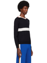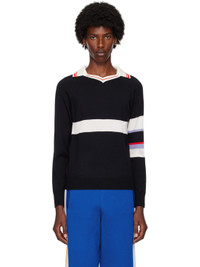 Knit wool- and silk-blend polo. Stripes throughout. · V-neck · Rib knit spread collar, hem, and cuffs · Raglan sleeves Supplier color: Navy/white