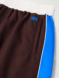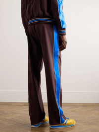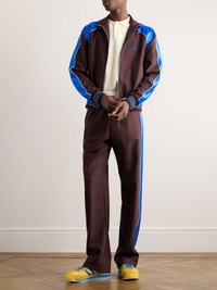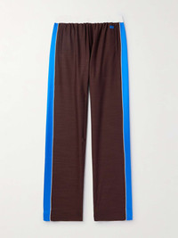 Wales Bonner's SS24 collection spotlights marathoners, so classic sportswear is a big theme. A touch more elevated than traditional styles, these shell-trimmed track pants have been made in Italy from soft wool and striped with lustrous satin down the sides. Style yours with the matching 'Courage' jacket. Size & Fit - Model wears a size larger to achieve a looser fit - Relaxed-straight leg, low-rise style - Elasticated at the waist - Mid-weight, stretchy fabric - Model is shown wearing an IT 48 - Model measures: waist size 30, height 6'2"/ 188cm Details & Care - Brown wool, white shell, bright-blue satin - 100% wool; trim: 100% viscose - Dry clean
