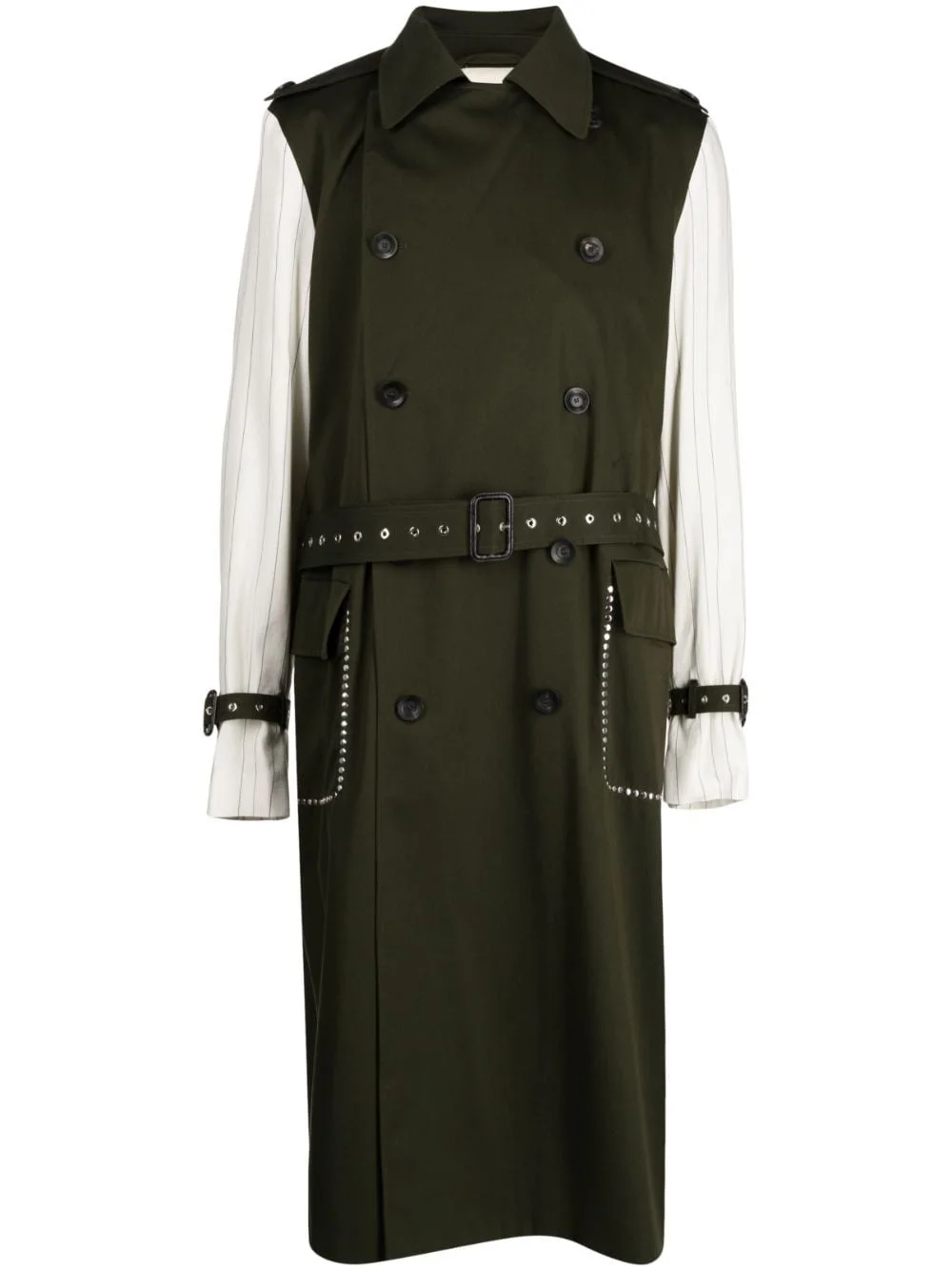 ECHO PANELLED TRENCH COAT FROM WALES BONNER FEATURING KHAKI, OFF-WHITE, COTTON, PANELLED DESIGN, SILVER-TONE STUD DETAILING, STRAIGHT-POINT COLLAR, DOUBLE-BREASTED BUTTON FASTENING, LONG SLEEVES, BELTED CUFFS, BELTED WAIST, TWO FRONT FLAP POCKETS AND MID-LENGTH.