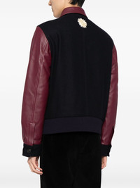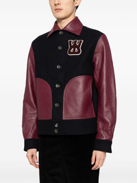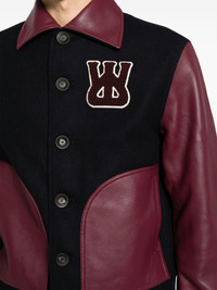 logo-applique varsity jacket Wales Bonner’s jacket riffs on classic varsity styles: note the contrasting leather colour-block panels and logo applique at the chest. It’s framed with a pointed collar. Highlights - Navy blue/wine red - Wool blend - Panelled design - Logo patch at the chest - Pointed flat collar - Front button fastening - Long sleeves - Two side welt pockets - Straight hem Imported Composition Outer: Wool 80%, Polyamide 20% Inner: Polyester 100% Body: Sheep Skin/Shearling 100% Lining: Viscose 100% Wool 45%, Acrylic 45%, Polyamide 8%, Elastane 2% SIZE & FIT Model measurements Height 6 ft 2 in(1.87 m) Bust/Chest 34.25 in(87 cm) Hips 36.22 in(92 cm) Waist 29.52 in(75 cm) FittingInformation Designed for a boxy fit, intended for a loose fit throughout Made from a heavyweight non-stretch fabric This piece fits true to size – take your usual size Washing instructions Dry Clean Only