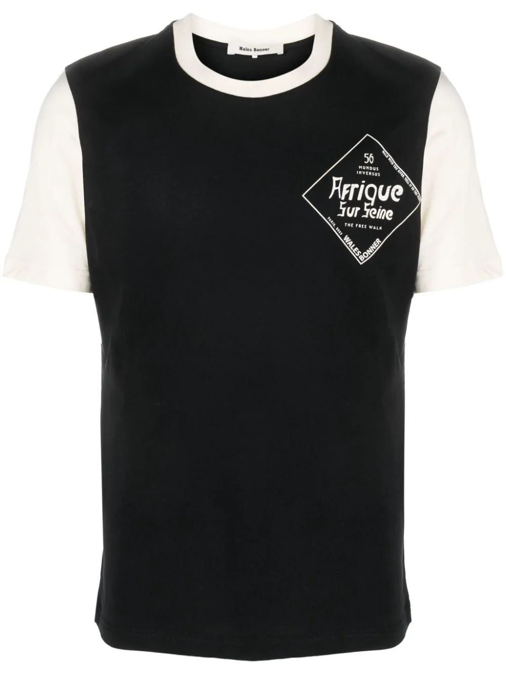 logo-print short-sleeve T-shirt Effortlessly tying in with current branding trends, this short-sleeve T-shirt from Wales Bonner features a minimalist two-tone palette and logo print at the chest. Highlights - Black - Logo print at the chest - Round neck - Short sleeves Imported Composition Organic Cotton 100% SIZE & FIT Model measurements Height 6 ft 1 in(1.86 m) Bust/Chest 37.4 in(95 cm) Hips 36.22 in(92 cm) Waist 29.52 in(75 cm) Measurement CHEST 40.94 in(104 cm) SLEEVE LENGTH 9.44 in(24 cm) Shoulder Width 17.32 in(44 cm) LENGTH 26.37 in(67 cm) FittingInformation Designed for a slim fit, offering a comfortable fit that sits just away from the body Made from a midweight non-stretch fabric, this piece offers minimal elasticity when worn This piece fits true to size – take your usual size Washing instructions Machine Wash