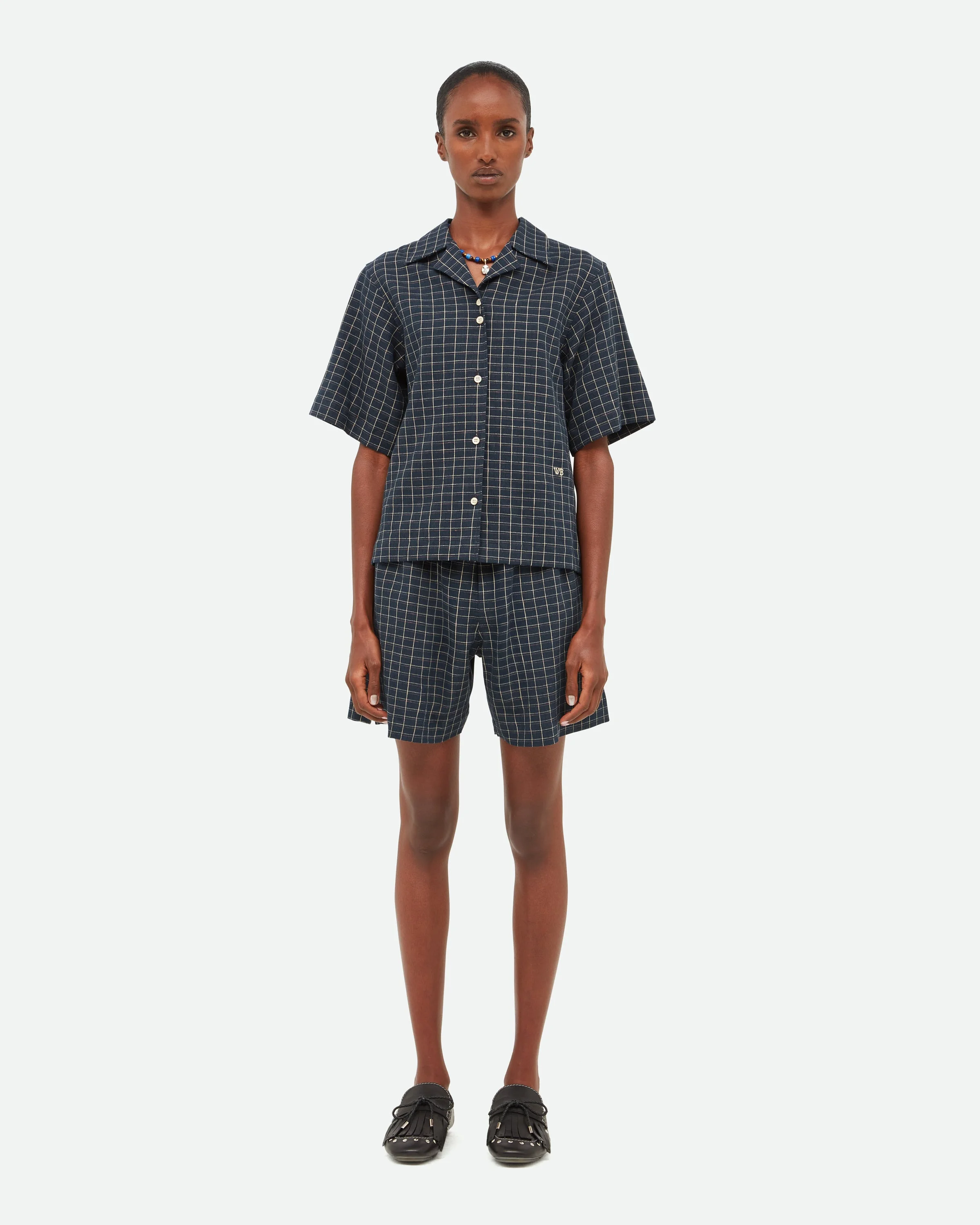 A bowling shirt crafted in slub linen check, presented in navy, ivory and rust.