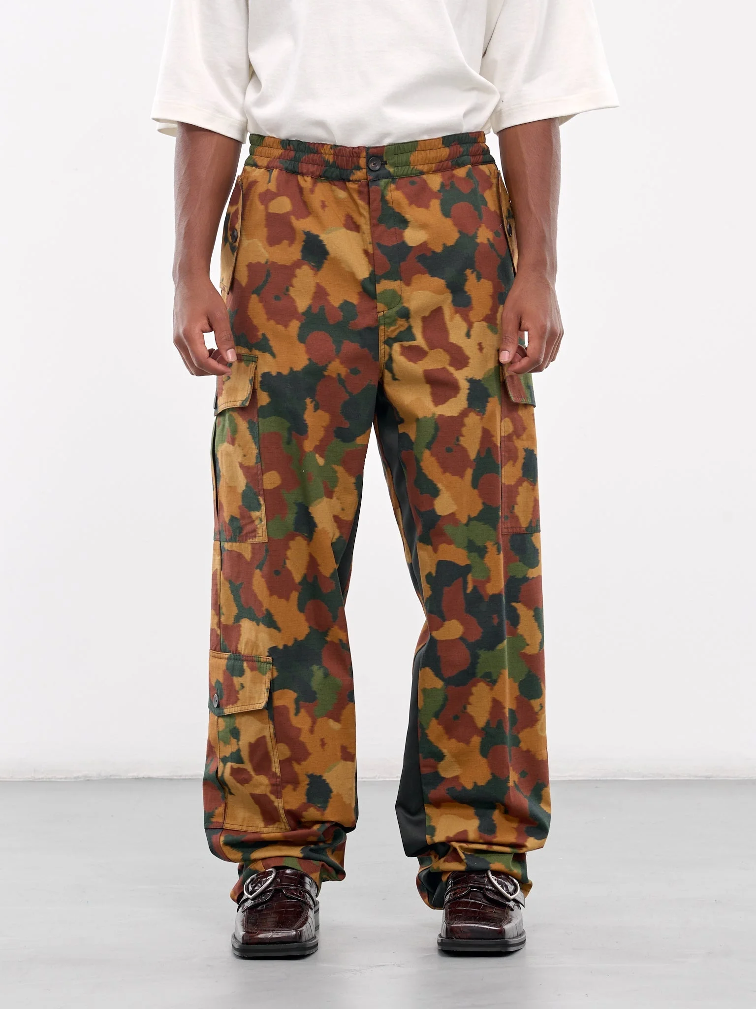 WALES BONNER pants in brown & green, paneled cotton construction, camouflage pattern, elasticated waistband, front button & concealed zip fly, side & back buttoned flap pockets, side cargo pockets, lined, wide leg, loose fit. Made in Portugal Outer: 100% Cotton Inner: 100% Cotton European Sizing Model is 5'11" wearing size 48. Shoulders: 18" Chest: 36.5" Waist: 29"