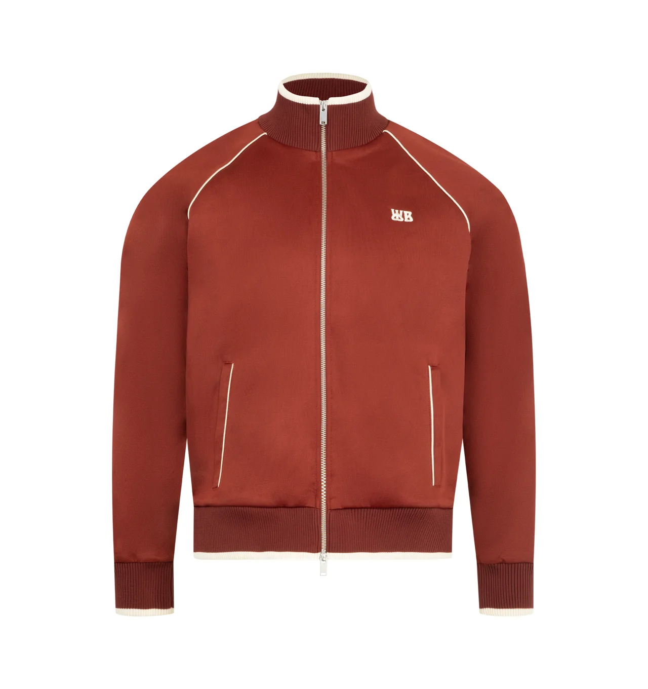 WALES BONNER Motion Track Top featuring funnel collar, front zip closure, front pockets, embroidered WB at chest and contrast piping. 55% polyester, 45% cotton. Made in Portugal. DESIGNER STYLE ID: MS26JE06-JE10-301 COLOR: RUST/IVORY