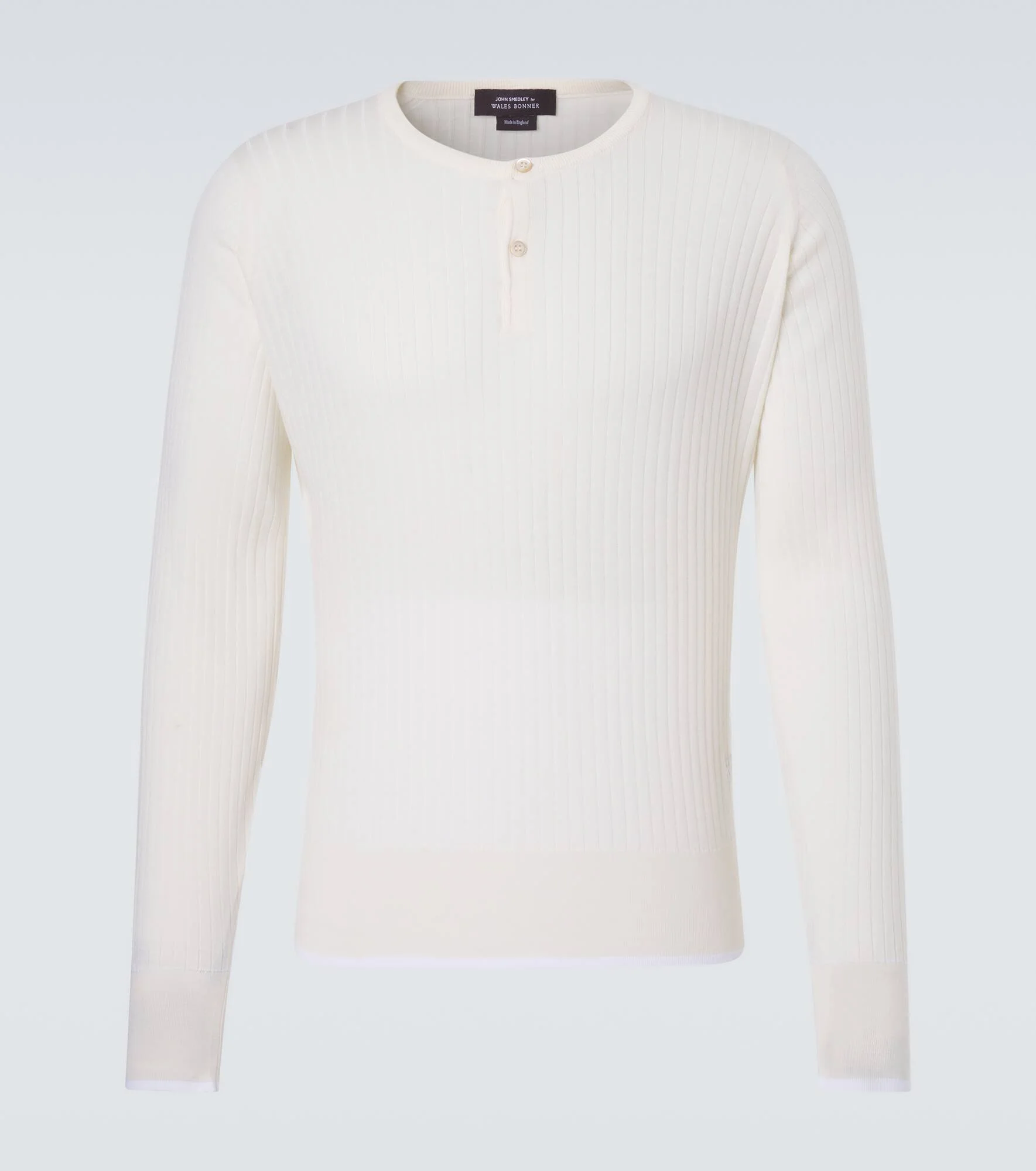 Wales Bonner channels its unique, irreverent style with meticulous cuts and unexpected motifs, creating what can be best described as tailored casualwear. Made from sumptuous wool and cotton, the Nile Henley shirt is complete with a ribbed-knit pattern. Product Details - Material: 54% wool, 46% cotton - Care instructions: machine wash at 30 degrees - Made in the UK - Color: white - Designer color name: Ivory - Contains non-textile parts of animal origin - Cuff: ribbed - Hem: ribbed - Item number: P01104034 Size & Fit - True to size - Semi-sheer - Slim fit - Stretchy fabric - Falls to the hip - Height of model is 189cm-74.5" and wears a size L