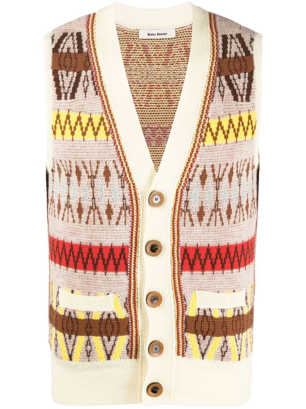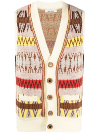 patterned intarsia knit vest patterned intarsia knit vest from Wales Bonner featuring multicolour, virgin wool blend, patterned intarsia knit, V-neck, front button fastening, sleeveless, straight hem and ribbed trim. Imported Composition Virgin Wool 60%, Polypropylene 24%, Merino 16% SIZE & FIT Model measurements Height 5 ft 10 in(1.79 m) Bust/Chest 31.9 in(81 cm) Hips 36.6 in(93 cm) Waist 24.4 in(62 cm) FittingInformation This piece fits true to size. We recommend you get your regular size Cut for a slim fit Made with a mid-weight fabric