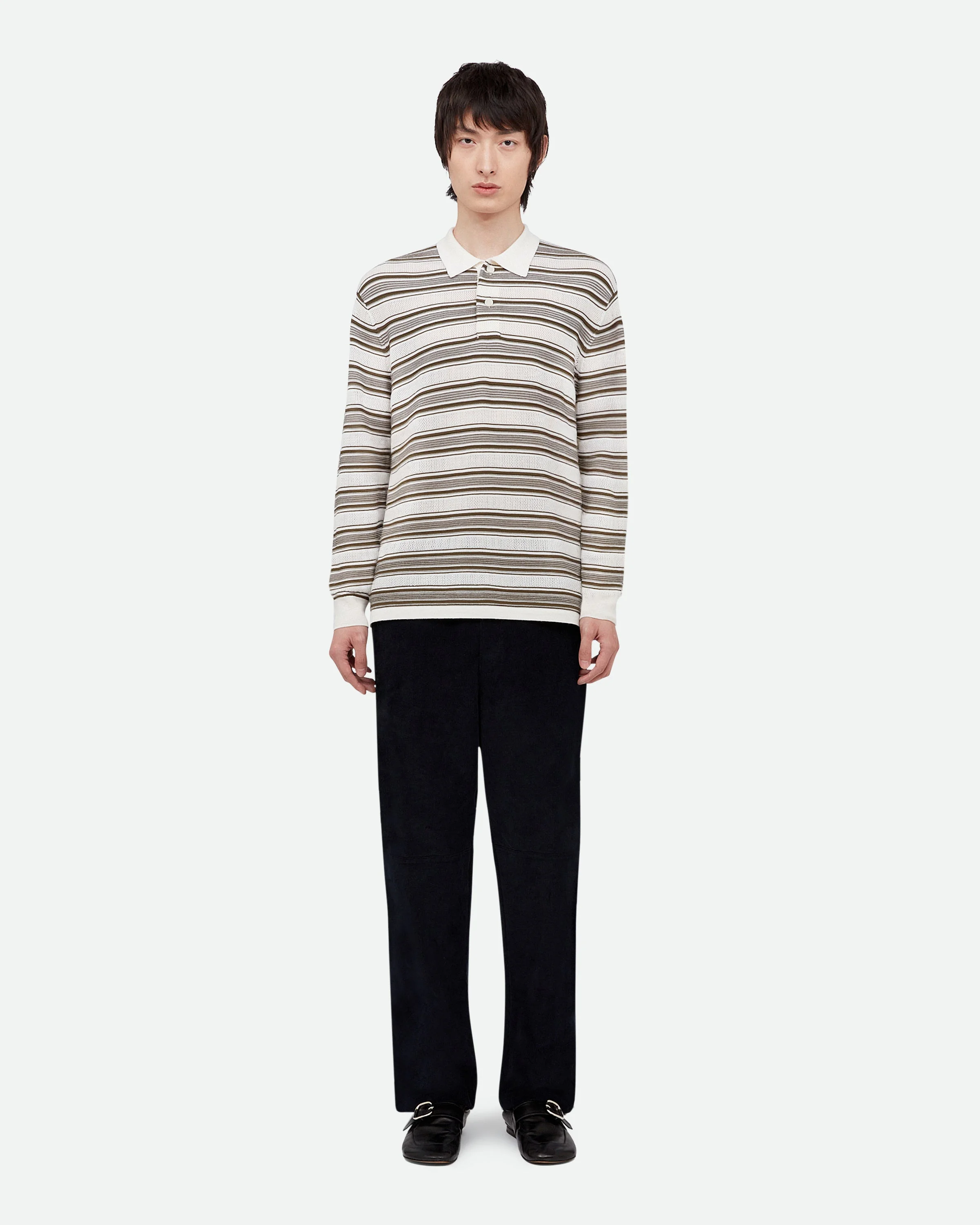 The Samuel Polo Top Breathable wool and viscose knit with contrast stitch stripes and color-block collar, hem, and cuff details. - Tonal Embroidered Logo - Regular Fit - 66% Wool, 23% Viscose, 12% Nylon