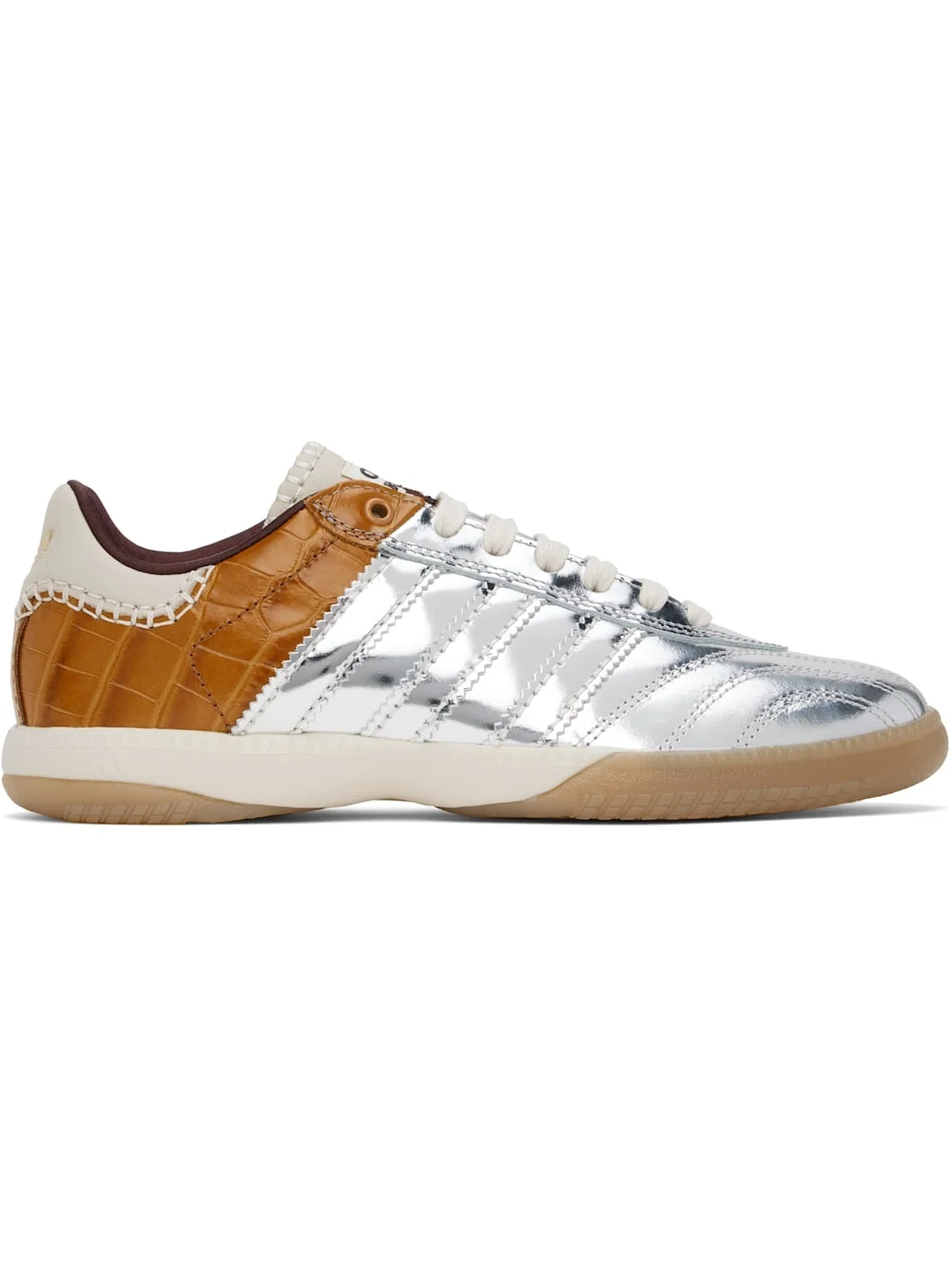 Low-top paneled lame and croc-embossed leather sneakers in silver tone and brown. · Lace-up closure · Logo patch at padded tongue · Padded collar · Serrated signature stripes at sides · Blanket stitching and logo embossed at suede heel tab · Satin lining · Treaded Torsion System® rubber sole · Contrast stitching in white Part of the Wales Bonner x adidas Originals collaboration. Supplier color: Silver metallic/Silver metallic/Easy yellow Upper: leather. Sole: rubber. Made in Viet Nam 251752M237004