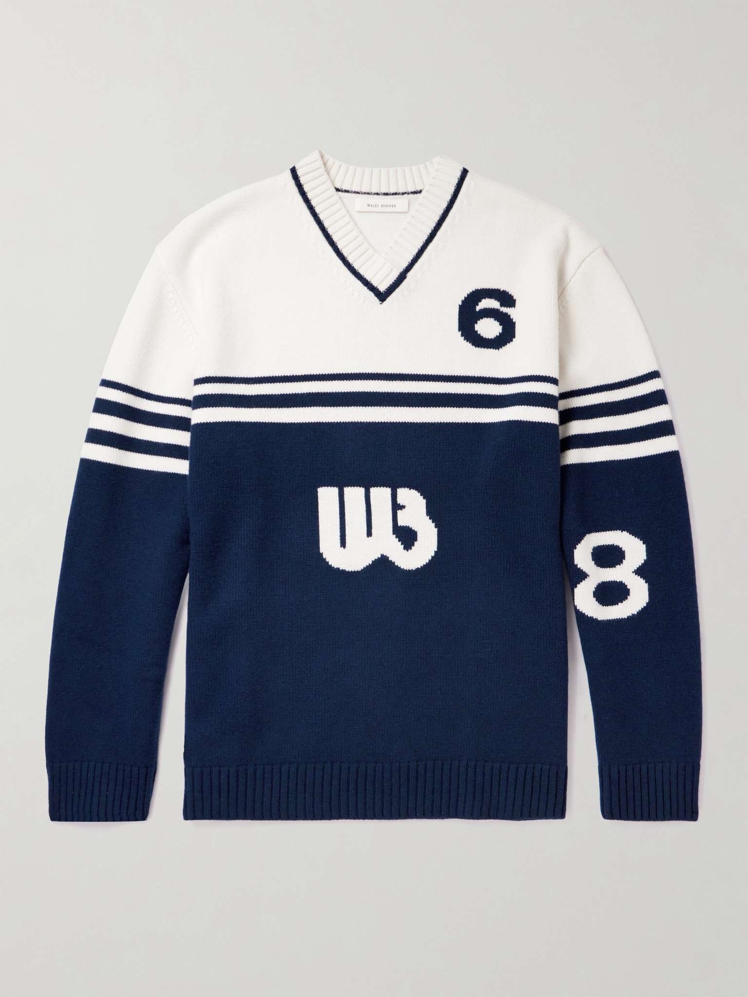 Wales Bonner's two-tone sweater is inspired by classic collegiate styles. It's cut for a relaxed fit and instarsia-knitted from wool with numerals and the brand's logo. Size & Fit - Model wears a size larger to achieve a looser fit - Weighted knit - Model is shown wearing a M - Model measures: chest 36"/ 92cm, height 6'1"/ 185cm Details & Care - Navy and cream wool - 100% wool - Hand wash