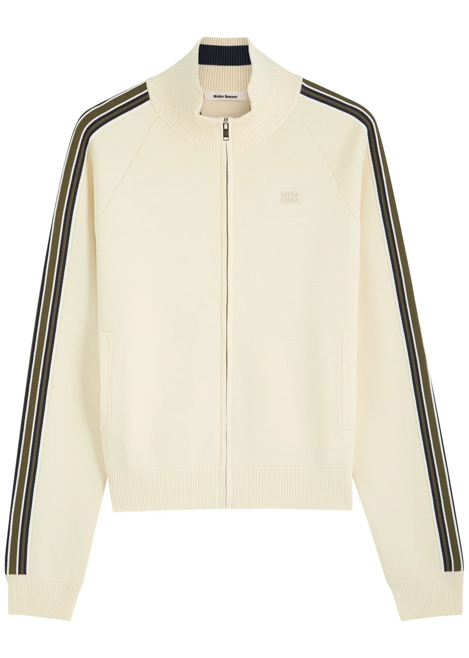 Info & Care Wales Bonner fine-knit jacket Stand collar, striped-intarsia through raglan sleeves, embroidered logo at chest, side slip pockets, ribbed trims; Zip fastening through front 75% viscose, 25% polyester, 2% nylon Hand wash Size & Fit Lenght shoulder to hem: 23.5 inches/ 59.5cm Midweight Regular fit Model is 6'1"/ 186cm, chest size 38.5 inches and wears a size medium