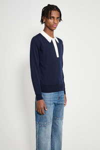 Polo from Wales Bonner x John Smedley. Fully fashioned in fine merino wool knit, presented in navy blue with ivory white accents. A knitted collar sits above a short button placket. Ribbing at cuffs and hem brings gentle structure to the edges. The body carries a smooth, lightweight handle.