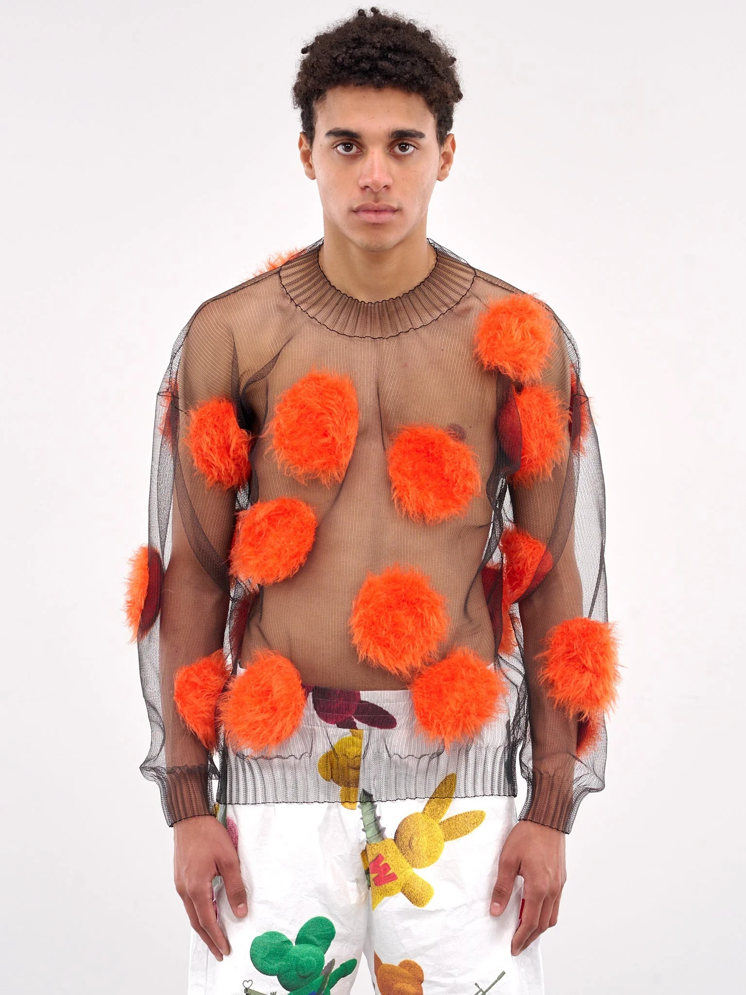 WALTER VAN BEIRENDONCK top in black & orange, paneled knit construction, sheer knit, polka dot contrast hairy pattern, ribbed crewneck, long sleeves, rib-knit cuffs & hem, straihgt hemline, relaxed fit. Standard/Italian Sizing Model is 6'1" wearing size M/48. Shoulders: 19" Chest: 38" Waist: 28"