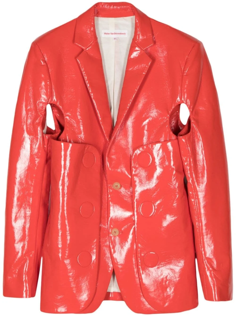 Star cut-out blazer Highlights - Flame red - High-shine finish - Layered effect - Cut-out detailing - Narrow notch lapels - Front button fastening - Long sleeves - Buttoned cuffs - Straight hem Made in Italy Composition Outer: Protein 53%, Polyurethane 21%, Polyester 21%, Other fibres 5% Lining: Polyester 100%