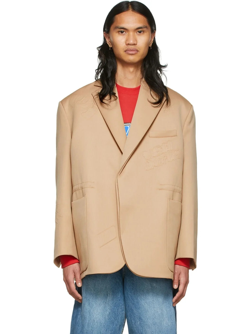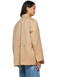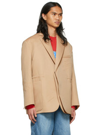 Wool and polyester-blend plain-woven blazer. · Notched lapel · Layered single-button closure · Welt pocket and patch pockets · Concealed bungee-style drawstring at waist · Padded shoulders · Vent at cuffs · Logo embossed throughout Supplier color: Beige Body: 50% wool, 50% polyester. Lining: 52% polyester, 48% rayon. Made in South Korea 221327M180028