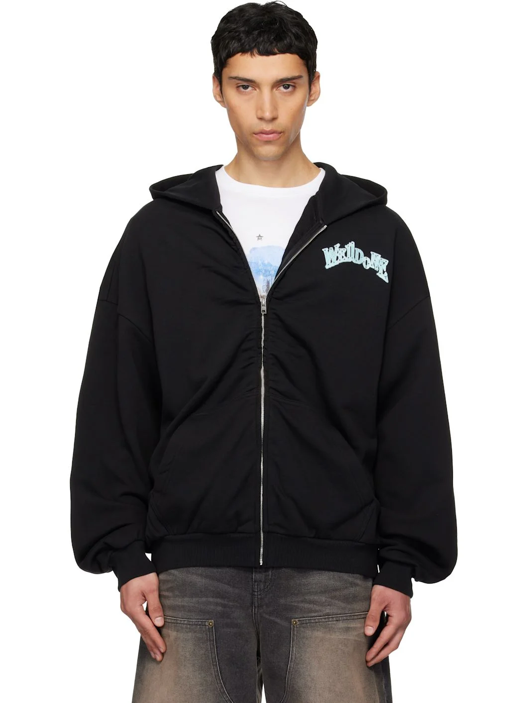 French terry hoodie. · Zip closure · Printed logo with rhinestones at chest · Patch pockets at front · Rib-knit hem and cuffs · Dropped shoulders · Logo graphic printed at back · Logo embroidered at back hem Supplier color: Black Body: 100% cotton. Trim: 95% cotton, 5% polyurethane. Made in South Korea 261327M202010
