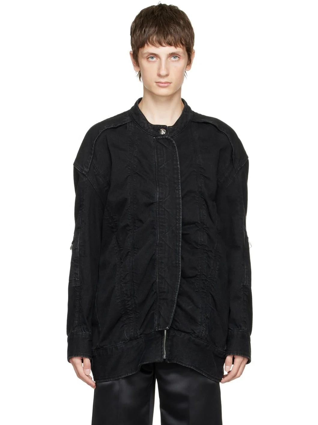Long sleeve non-stretch denim jacket in black featuring ruching throughout. · Stand collar · Partially concealed zip closure · Zip pocket at sleeves · Single-button barrel cuffs · Signature logo hardware in silver-tone Supplier color: Black Body: 100% cotton. Lining: 65% polyester, 35% cotton. Made in South Korea 221327M177021