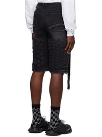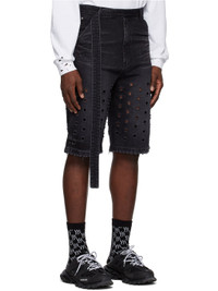 Non-stretch denim shorts. Fading, distressing, whiskering, and cut-outs throughout. · Integrated self-tie belt at waistband · Zip-fly · Five-pocket styling · Frayed edge at cuffs Supplier color: Wash black 100% cotton.